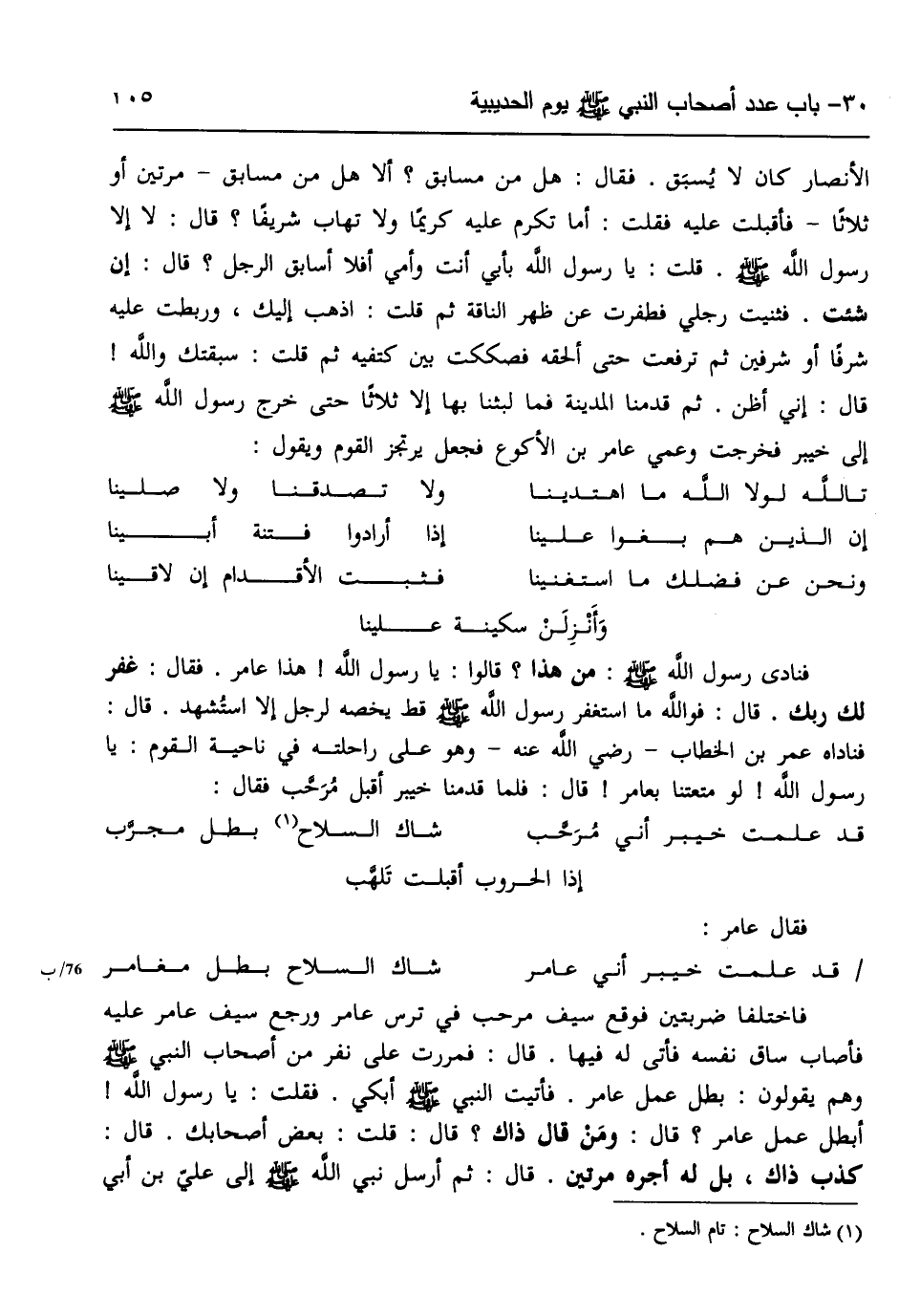 فَنَادَى رَسُولُ اللهِ صَلَّى الله عَلَيهِ وسَلَّم : مَنْ هَذَا ؟ قَالُوا : يَا رَسُولَ اللهِ ، هَذَا عَامِرٌ ، فَقَالَ : غَفَرَ لَكَ رَبُّكَ ، قَالَ : فَوَاللَّهِ مَا اسْتَغْفَرَ رَسُولُ اللهِ صَلَّى الله عَلَيهِ وسَلَّم قَطُّ يَخُصُّهُ لِرَجُلٍ إِلا اسْتُشْهِدَ ، قَالَ : فَنَادَاهُ عُمَرُ بْنُ الْخَطَّابِ رَضِيَ اللَّهُ عَنْهُ وَهُوَ عَلَى رَاحِلَتِهِ فِي نَاحِيَةِ الْقَوْمِ : يَا رَسُولَ اللهِ ، لَوْ مَتَّعْتَنَا بِعَامِرٍ ، قَالَ : فَلَمَّا قَدِمْنَا خَيْبَرَ أَقْبَلَ مَرْحَبٌ ، فَقَالَ :
