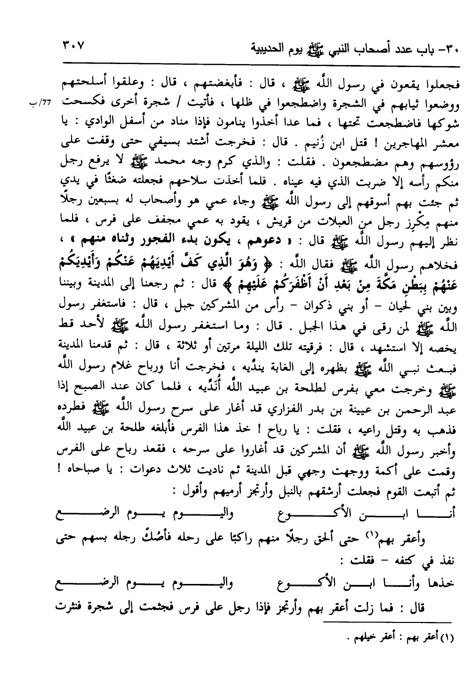 قَالَ فَمَا زِلْتُ أَعْقِرُ بِهِمْ وَأَرْتَجِزُ، فَإِذَا رَجُلٌ عَلَى فَرَسٍ، فَجَثَمْتُ إِلَى شَجَرَةٍ فَنَثَرْتُ -[308]- نَبْلِي ثُمَّ عَقَرْتُ بِهِ، وَلَا يَقْدُمُ عَلَيَّ، قَالَ: فَمَا زَالَ ذَلِكَ شَأْنِي وَشَأْنُهُمْ حَتَّى مَا تَرَكْتُ شَيْئًا مِنْ ظَهْرِ رَسُولِ اللَّهِ صَلَّى اللهُ عَلَيْهِ وَسَلَّمَ إِلَّا اسْتَنْقَذْتُهُ، وَجَعَلْتُهُ وَرَاءَ ظَهْرِي، قَالَ: وَطَرَحُوا أَكْثَرَ مِنْ ثَلَاثِينَ بُرْدَةً وَثَلَاثِينَ رُمْحًا كُلُّ ذَلِكَ يَسْتَخِفُّونَ مِنِّي، وَأَجْعَلُ عَلَيْهِ آرَامًا حَتَّى لَا يَخْفَى عَلَى رَسُولِ اللَّهِ صَلَّى اللهُ عَلَيْهِ وَسَلَّمَ، وَلَا عَلَى أَصْحَابِهِ حَتَّى إِذَا امْتَدَّ الضُّحَى الْأَكْبَرُ، قَالَ: وَدَخَلُوا الْمَضِيقَ عَلَوْتُ الْجَبَلَ، وَجَعَلْتُ أُرَدِّيهِمْ بِالْحِجَارَةِ إِذَا عُيَيْنَةُ بْنُ بَدْرٍ قَدْ جَاءَ مَدَدًا لِلْمُشْرِكِينَ فَنَزَلُوا يَتَضَحَّوْنَ فَأَشْرَفَ عَلَى جَبَلٍ فَأَقْعَدَ عَلَيْهِ، فَقَالَ عُيَيْنَةُ: مَا هَذَا الَّذِي أَرَى؟، قَالُوا: هَذَا لَقِينَا مِنْهُ الْبَرْحَ فَوَاللَّهِ إِنْ فَارَقَنَا بِغَلَسٍ حَتَّى اسْتَنْقَذَ كُلَّ شَيْءٍ فِي أَيْدِينَا، فَقَالَ عُيَيْنَةُ: لَوْلَا أَنَّ هَذَا يَرَى وَرَاءَهُ طَلَبًا، لَتَرَكَكُمْ لِيَقُمْ إِلَيْهِ مَعِي مِنْكُمْ، فَقَامَ أَرْبَعَةٌ فَسَنَدُوا إِلَيَّ فِي الْجَبَلِ فَلَمَّا أَسْمَعْتُهُمُ الصَّوْتَ، قُلْتُ لَهُمْ: أَتَعْرِفُونِي؟، قَالُوا: وَمَنْ أَنْتَ؟، قُلْتُ: أَنَا ابْنُ الْأَكْوَعِ وَالَّذِي كَرَّمَ وَجْهَ مُحَمَّدٍ صَلَّى اللهُ عَلَيْهِ وَسَلَّمَ لَا يَطْلُبُنِي رَجُلٌ مِنْكُمْ فَيُدْرِكُنِي وَلَا أَطْلُبُهُ فَيَفُوتُنِي، فَقَالَ أَحَدُهُمْ: إِنِّي أَظُنُّ، فَوَاللَّهِ مَا بَرِحْتُ مَقْعَدِي ذَاكَ حَتَّى رَأَيْتُ فَوَارِسَ رَسُولِ اللَّهِ صَلَّى اللهُ عَلَيْهِ وَسَلَّمَ يَتَخَلَّلُونَ الشَّجَرَ فَإِذَا أَوَّلُهُمُ الْأَخْرَمُ الْأَسَدِيُّ وَإِذَا عَلَى إِثْرِهِ أَبُو قَتَادَةَ، وَإِذَا عَلَى إِثْرِ أَبِي قَتَادَةَ الْمِقْدَادُ بْنُ الْأَسْوَدِ الْكِنْدِيُّ، وَوَلَّوْا مُدْبِرِينَ، فَأَعْرَضَ الْأَخْرَمُ الْأَسَدِيُّ فَآخُذُ بِعِنَانِ فَرَسِهِ، فَقُلْتُ: يَا أَخْرَمُ أَنْذِرْهُمْ فَإِنَّ الْقَوْمَ قَلِيلٌ خَبِيثٌ، وَلَا آمَنُهُمْ أَنْ يَقْتَطِعُوكَ حَتَّى يَلْحَقَ رَسُولُ اللَّهِ صَلَّى اللهُ عَلَيْهِ وَسَلَّمَ وَأَصْحَابُهُ، فَقَالَ: يَا سَلَمَةُ إِنْ كُنْتَ تُؤْمِنُ بِاللَّهِ وَالْيَوْمِ الْآخِرِ وَتَعْلَمُ أَنَّ الْجَنَّةَ حَقٌّ وَالنَّارَ حَقٌّ فَلَا تَحُلْ بَيْنِي وَبَيْنَ الشَّهَادَةِ، قَالَ: وَالتَقَى هُوَ وَعَبْدُ الرَّحْمَنِ، فَاخْتَلَفَا ضَرْبَتَيْنِ فَقَتَلَهُ، وَعَقَرَ عَبْدُ الرَّحْمَنِ فَرَسَهُ، وَتَحَوَّلَ عَبْدُ الرَّحْمَنِ عَلَى فَرَسِ الْأَخْرَمِ، وَيَلْحَقُهُ أَبُو قَتَادَةَ فَارِسُ رَسُولِ اللَّهِ صَلَّى اللهُ عَلَيْهِ وَسَلَّمَ فَاخْتَلَفَا طَعْنَتَيْنِ، فَقَتَلَهُ أَبُو قَتَادَةَ وَعُقِرَ بِأَبِي قَتَادَةَ فَرَسُهُ، وَتَحَوَّلَ أَبُو قَتَادَةَ عَلَى فَرَسِ الْأَخْرَمِ، قَالَ: وَخَرَجَ الْمُشْرِكُونَ لَا يَلْوُوُنَ عَلَى شَيْءٍ قَالَ: فَوَالَّذِي كَرَّمَ وَجْهَ مُحَمَّدٍ صَلَّى اللهُ عَلَيْهِ وَسَلَّمَ إِنِّي بِطَلَبِ الْخَيْلِ وَالرِّكَابِ وَالرِّجَالِ الَّذِينَ مَعَ رَسُولِ اللَّهِ صَلَّى اللهُ عَلَيْهِ وَسَلَّمَ حَتَّى مَا أَرَى غُبَارَهُمْ، قَالَ: فَعَرَضُوا الشِّعْبَ فِيهِ مَاءٌ يُقَالُ لَهُ ذُو قَرَدٍ يُرِيدُونَ أَنْ يَشْرَبُوا مِنْهُ وَهُمْ عِطَاشٌ، قَالَ: فَنَظَرُوا إِلَيَّ أَعْدُو وَرَاءَهُمْ، قَالَ: فَحَلَّأْتُهُمْ، فَمَا ذَاقُوا مِنْهُ قَطْرَةً وَهُمْ عِطَاشٌ حَتَّى سُنِدُوا فِي ثَن