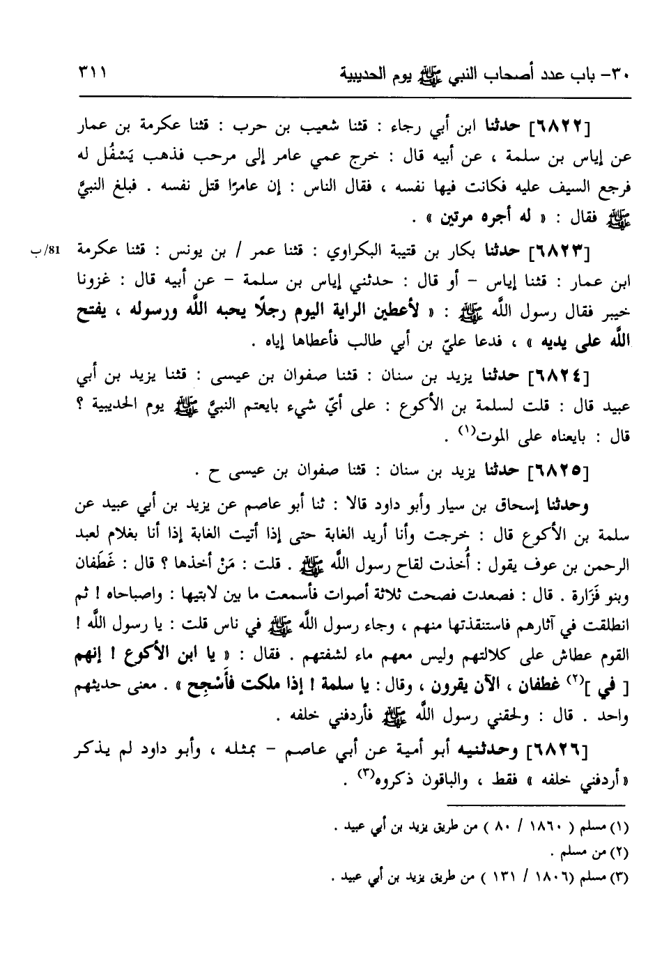 6825 - حَدَّثَنَا يَزِيدُ بْنُ سِنَانٍ، قثنا صَفْوَانُ بْنُ عِيسَى ح وَحَدَّثَنَا إِسْحَاقُ بْنُ سَيَّارٍ، وَأَبُو دَاوُدَ، قَالَا: ثنا أَبُو عَاصِمٍ، عَنْ يَزِيدَ بْنِ أَبِي عُبَيْدٍ، عَنْ سَلَمَةَ بْنِ الْأَكْوَعِ، قَالَ: §خَرَجْتُ وَأَنَا أُرِيدُ الْغَابَةَ، حَتَّى إِذَا أَتَيْتُ الْغَابَةَ، إِذَا أَنَا بِغُلَامٍ لِعَبْدِ الرَّحْمَنِ بْنِ عَوْفٍ، يَقُولُ: أُخِذَتْ لِقَاحُ رَسُولِ اللَّهِ صَلَّى اللهُ عَلَيْهِ وَسَلَّمَ، قُلْتُ: مَنْ أَخَذَهَا؟، قَالَ: غَطَفَانُ وَبَنُو فَزَارَةَ، قَالَ: فَصَعِدْتُ فَصِحْتُ ثَلَاثَةَ أَصْوَاتٍ، فَأَسْمَعْتُ مَا بَيْنَ لَابَتَيْهَا: واصَبَاحَاهُ، ثُمَّ انْطَلَقْتُ فِي آثَارِهِمْ فَاسْتَنْقَذْتُهَا مِنْهُمْ، وَجَاءَ رَسُولُ اللَّهِ صَلَّى اللهُ عَلَيْهِ وَسَلَّمَ فِي نَاسٍ، قُلْتُ: يَا رَسُولَ اللَّهِ الْقَوْمُ عِطَاشٌ عَلَى كَلَالَتِهِمْ، وَلَيْسَ مَعَهُمْ مَاءٌ لِشِفْتِهِمْ، فَقَالَ: يَا ابْنَ الْأَكْوَعِ إِنَّهُمْ فِي غَطَفَانَ الْآنَ يَقْرَوْنَ، وَقَالَ: «يَا سَلَمَةُ إِذَا مَلَكْتَ فَأَسْجِحْ» ، مَعْنَى حَدِيثِهِمْ وَاحِدٌ، قَالَ: وَلَحِقَنِي رَسُولُ اللَّهِ صَلَّى اللهُ عَلَيْهِ وَسَلَّمَ، فَأَرْدَفَنِي خَلْفَهُ،