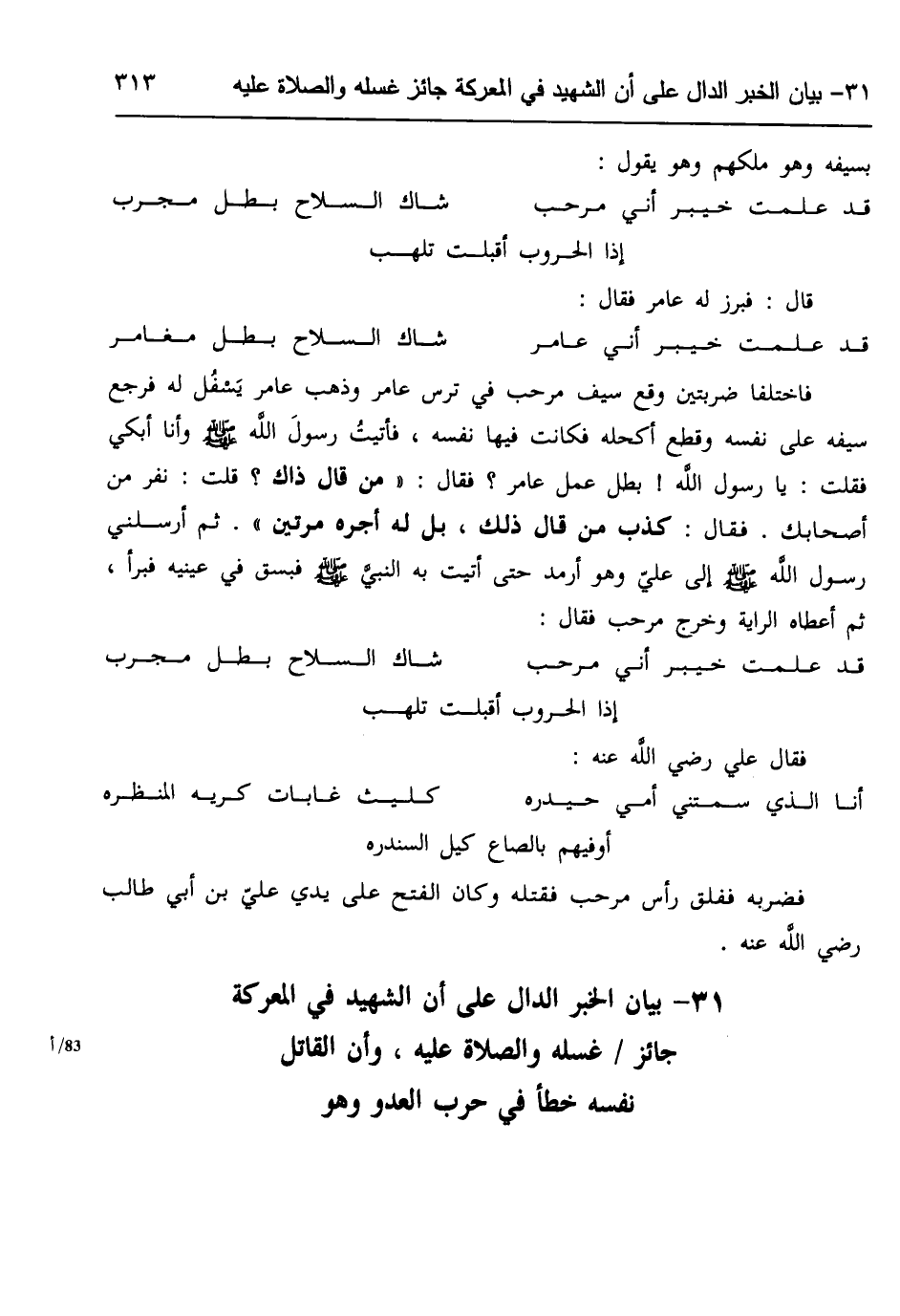 فَاخْتَلَفَا ضَرْبَتَيْنِ وَقَعَ سَيْفُ مَرْحَبٍ فِي تُرْسِ عَامِرٍ ، وَذَهَبَ عَامِرٌ يَسْفُلُ لَهُ ، فَرَجَعَ سَيْفُهُ عَلَى نَفْسِهِ ، وَقَطَعَ أَكْحَلَهُ ، فَكَانَتْ فِيهَا نَفْسُهُ ، فَأَتَيْتُ رَسُولَ اللهِ صَلَّى الله عَلَيهِ وسَلَّم وَأَنَا أَبْكِي ، فَقُلْتُ : يَا رَسُولَ اللهِ ، بَطُلَ عَمَلُ عَامِرٍ ، فَقَالَ : مَنْ قَالَ ذَاكَ ؟ قُلْتُ : نَفَرٌ مِنْ أَصْحَابِكَ ، فَقَالَ : كَذبَ مَنْ قَالَ ذَلِكَ ، بَلْ لَهُ أَجْرُهُ مَرَّتَيْنِ ، ثُمَّ أَرْسَلَنِي رَسُولُ اللهِ صَلَّى الله عَلَيهِ وسَلَّم إِلَى عَلِيٍّ ، وَهُوَ أَرْمَدُ حَتَّى أَتَيْتُ بِهِ النَّبِيَّ صَلَّى الله عَلَيهِ وسَلَّم ، فَبَسَقَ فِي عَيْنِهِ ، فَبَرَأَ ثُمَّ أَعْطَاهُ الرَّايَةَ ، وَخَرَجَ مَرْحَبٌ ، فَقَالَ :