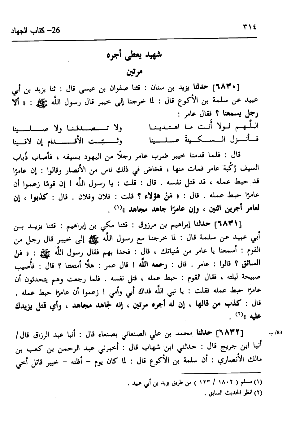 6831 - حَدَّثَنَا إِبْرَاهِيمُ بْنُ مَرْزُوقٍ، قثنا مَكِّيُّ بْنُ إِبْرَاهِيمَ، قثنا يَزِيدُ بْنُ أَبِي عُبَيْدٍ، عَنْ سَلَمَةَ، قَالَ: لَمَّا §خَرَجْنَا مَعَ رَسُولِ اللَّهِ صَلَّى اللهُ عَلَيْهِ وَسَلَّمَ إِلَى خَيْبَرَ، قَالَ رَجُلٌ مِنَ الْقَوْمِ: أَسْمِعْنَا يَا عَامِرُ مِنْ هُنَيَّاتِكَ، قَالَ: فَحَدَا بِهِمْ، فَقَالَ رَسُولُ اللَّهِ صَلَّى اللهُ عَلَيْهِ وَسَلَّمَ: «مَنِ السَّائِقُ؟» ، قَالُوا: عَامِرٌ، قَالَ: «رَحِمَهُ اللَّهُ» ، قَالَ عُمَرُ: هَلَّا أَمْتَعْتَنَا؟، قَالَ: فَأُصِيبَ صَبِيحَةَ لَيْلَتِهِ، فَقَالَ الْقَوْمُ: حَبِطَ عَمَلُهُ، قَتَلَ نَفْسَهُ، فَلَمَّا رَجَعْتُ وَهُمْ يَتَحَدَّثُونَ أَنَّ عَامِرًا حَبِطَ عَمَلُهُ، فَقُلْتُ: يَا نَبِيَّ اللَّهُ فِدَاكَ أَبِي وَأُمِّي، زَعَمُوا أَنَّ عَامِرًا حَبِطَ عَمَلُهُ، قَالَ: «كَذِبَ مَنْ قَالَهَا، إِنَّ لَهُ أَجْرَهُ مَرَّتَيْنِ إِنَّهُ لَجَاهِدٌ مُجَاهِدٌ، وَأَيُّ قَتْلٍ يَزِيدُكَ عَلَيْهِ»