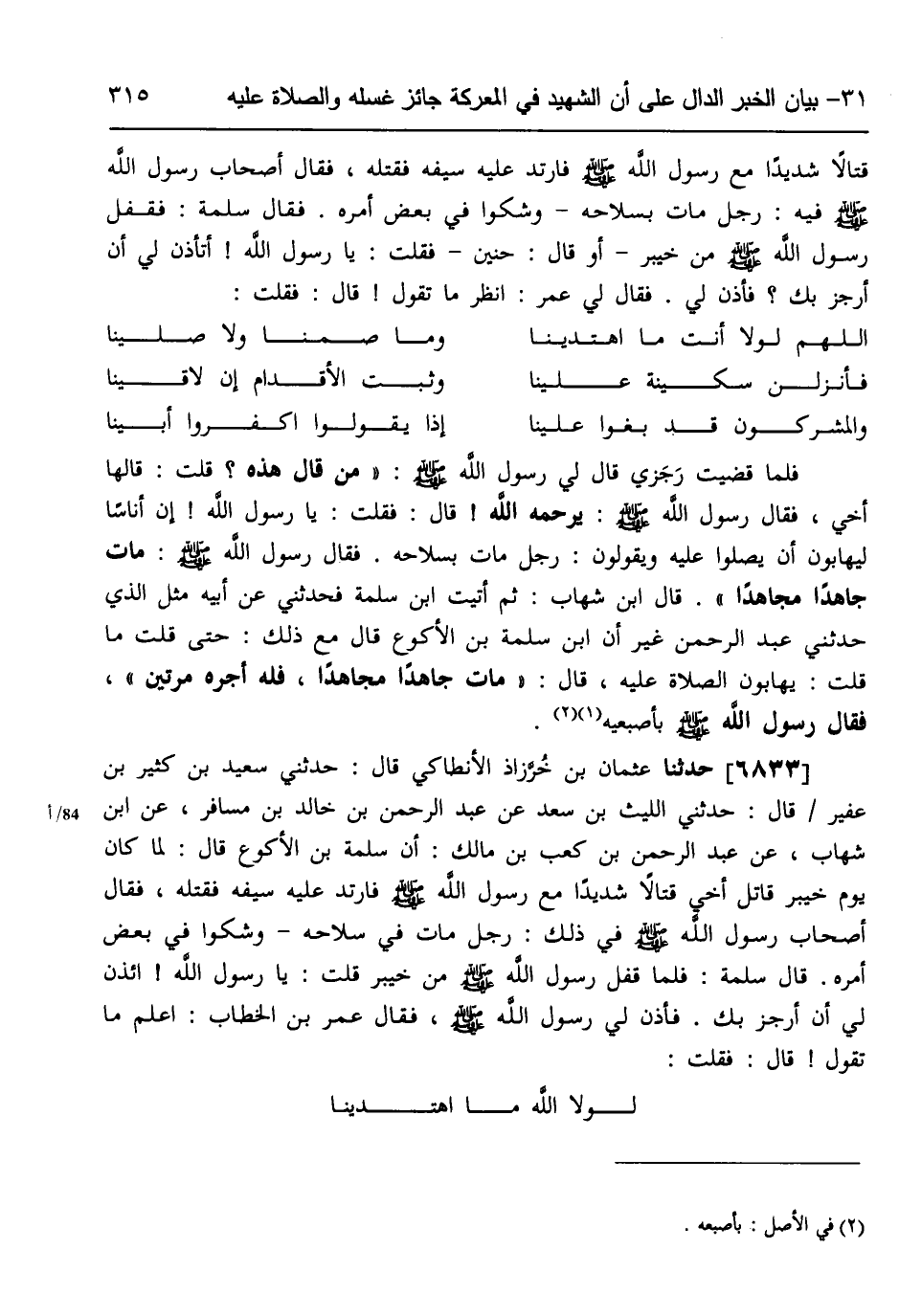 6833 - حَدَّثَنَا عُثْمَانُ بْنُ خُرَّزَاذَ الْأَنْطَاكِيُّ، قَالَ: حَدَّثَنِي سَعِيدُ بْنُ كَثِيرِ بْنِ عُفَيْرٍ، قَالَ: حَدَّثَنِي اللَّيْثُ بْنُ سَعْدٍ، عَنْ عَبْدِ الرَّحْمَنِ بْنِ خَالِدِ بْنِ مُسَافِرٍ، عَنِ ابْنِ شِهَابٍ، عَنْ عَبْدِ الرَّحْمَنِ بْنِ كَعْبِ بْنِ مَالِكٍ، أَنَّ سَلَمَةَ بْنَ الْأَكْوَعِ، قَالَ: لَمَّا كَانَ يَوْمُ خَيْبَرَ، §قَاتَلَ أَخِي قِتَالًا شَدِيدًا مَعَ رَسُولِ اللَّهِ صَلَّى اللهُ عَلَيْهِ وَسَلَّمَ فَارْتَدَّ عَلَيْهِ سَيْفُهُ فَقَتَلَهُ، فَقَالَ أَصْحَابُ رَسُولِ اللَّهِ صَلَّى اللهُ عَلَيْهِ وَسَلَّمَ فِي ذَلِكَ: رَجُلٌ مَاتَ فِي سِلَاحِهِ، وَشَكُّوا فِي بَعْضِ أَمْرِهِ، قَالَ سَلَمَةُ: فَلَمَّا قَفَلَ رَسُولُ اللَّهِ صَلَّى اللهُ عَلَيْهِ وَسَلَّمَ مِنْ خَيْبَرَ قُلْتُ: يَا رَسُولَ اللَّهِ ائْذَنْ لِي أَنْ أَرْجُزَ بِكَ، فَأَذِنَ لِي رَسُولُ اللَّهِ صَلَّى اللهُ عَلَيْهِ وَسَلَّمَ، فَقَالَ عُمَرُ بْنُ الْخَطَّابِ: اعْلَمْ مَا تَقُولُ، قَالَ: فَقُلْتُ: