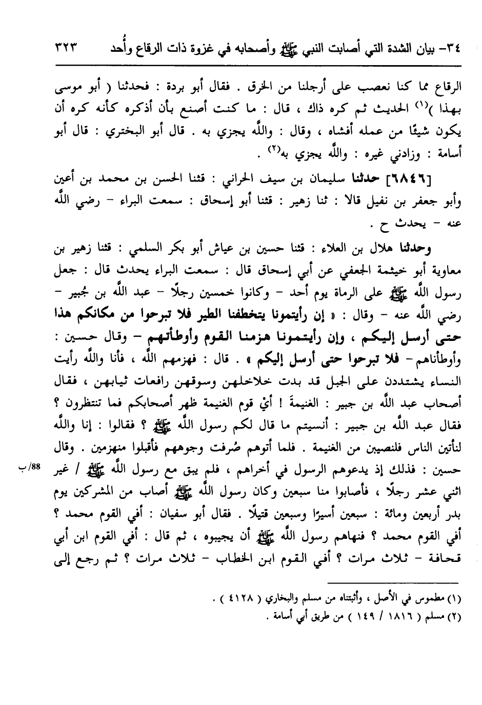 6846 - حَدَّثَنَا سُلَيْمَانُ بْنُ سَيْفٍ الْحَرَّانِيُّ، قثنا الْحَسَنُ بْنُ مُحَمَّدِ بْنِ أَعْيَنَ، وَأَبُو جَعْفَرَ بْنُ نُفَيْلٍ، قَالَا: ثنا زُهَيْرٌ، قثنا أَبُو إِسْحَاقَ، سَمِعْتُ الْبَرَاءَ رَضِيَ اللَّهُ عَنْهُ يُحَدِّثُ ح وَحَدَّثَنَا هِلَالُ بْنُ الْعَلَاءِ، قثنا حُسَيْنُ بْنُ عَيَّاشٍ أَبُو بَكْرٍ السُّلَمِيُّ، قثنا زُهَيْرُ بْنُ مُعَاوِيَةَ أَبُو خَيْثَمَةَ الْجُعْفِيُّ، عَنْ أَبِي إِسْحَاقَ، قَالَ: سَمِعْتُ الْبَرَاءَ يُحَدِّثُ، قَالَ: §جَعَلَ رَسُولُ اللَّهِ صَلَّى اللهُ عَلَيْهِ وَسَلَّمَ عَلَى الرُّمَاةِ يَوْمَ أُحُدٍ، وَكَانُوا خَمْسِينَ رَجُلًا عَبْدَ اللَّهِ بْنَ جُبَيْرٍ رَضِيَ اللَّهُ عَنْهُ، وَقَالَ: «إِنْ رَأَيْتُمُونَا يَتَخَطَّفُنَا الطَّيْرُ فَلَا تَبْرَحُوا مِنْ مَكَانِكُمْ هَذَا حَتَّى أُرْسِلَ إِلَيْكُمْ، وَإِنْ رَأَيْتُمُونَا هَزَمْنَا الْقَوْمَ وَأَوْطَأْتُهُمْ» ، وَقَالَ حُسَيْنٌ: «وَأَوْطَأْنَاهُمْ فَلَا تَبْرَحُوا حَتَّى أُرْسِلَ إِلَيْكُمْ» ، قَالَ: فَهَزَمَهُمُ اللَّهُ فَأَنَا وَاللَّهِ رَأَيْتُ النِّسَاءَ يَشْتَدُّونَ عَلَى الْجَبَلِ قَدْ بَدَتْ خَلَاخِلُهُنَّ وَسُوقُهُنَّ رَافِعَاتٍ ثِيَابَهُنَّ، فَقَالَ أَصْحَابُ عَبْدِ اللَّهِ بْنِ جُبَيْرٍ الْغَنِيمَةَ: أَيْ قَوْمِ الْغَنِيمَةَ ظَهْرَ أَصْحَابُكُمْ فَمَا تَنْتَظِرُونَ؟، فَقَالَ عَبْدُ اللَّهِ بْنُ جُبَيْرٍ: أَنَسِيتُمْ مَا قَالَ لَكُمْ رَسُولُ اللَّهِ صَلَّى اللهُ عَلَيْهِ وَسَلَّمَ؟، فَقَالُوا: إِنَّا وَاللَّهِ لَنَأْتِيَنَّ النَّاسَ فَلَنُصِيبَنَّ مِنَ الْغَنِيمَةِ، فَلَمَّا أَتَوْهُمْ صُرِفَتْ وجُوهُهُمْ فَأَقْبَلُوا مُنْهَزِمِينَ، وَقَالَ حُسَيْنٌ: فَذَلِكَ إِذْ يَدْعُوهُمُ الرَّسُولُ فِي أُخْرَاهُمْ فَلَمْ يَبْقَ مَعَ رَسُولِ اللَّهِ صَلَّى اللهُ عَلَيْهِ وَسَلَّمَ غَيْرُ اثْنَيْ عَشَرَ رَجُلًا فَأَصَابُوا مِنَّا سَبْعِينَ، وَكَانَ رَسُولُ اللَّهِ صَلَّى اللهُ عَلَيْهِ وَسَلَّمَ أَصَابَ مِنَ الْمُشْرِكِينَ يَوْمَ بَدْرٍ أَرْبَعِينَ وَمِائَةً سَبْعِينَ أَسِيرًا وَسَبْعِينَ قَتِيلًا، فَقَالَ أَبُو سُفْيَانَ: أَفِي الْقَوْمِ مُحَمَّدٌ؟ أَفِي الْقَوْمِ مُحَمَّدٌ؟، فَنَهَاهُمْ رَسُولُ اللَّهِ صَلَّى اللهُ عَلَيْهِ وَسَلَّمَ أَنْ يُجِيبُوهُ، ثُمَّ قَالَ: أَفِي الْقَوْمِ ابْنُ أَبِي قُحَافَةَ؟، ثَلَاثَ مَرَّاتٍ، أَفِي الْقَوْمِ ابْنُ الْخَطَّابِ؟، ثَلَاثَ مَرَّاتٍ ثُمَّ رَجَعَ إِلَى -[324]- أَصْحَابِهِ، فَقَالَ: أَمَّا هَؤُلَاءِ فَقَدْ قُتِلُوا، قَالَ فَمَا مَلَكَ عُمَرُ نَفْسَهُ فَقَالَ: كَذَبْتَ وَاللَّهِ يَا عَدُوَّ اللَّهِ إِنَّ الَّذِينَ عَدَدْتَ لَأَحْيَاءٌ كُلُّهُمْ، وَقَدْ بَقِيَ لَكَ مَا يَسُوءُكَ، فَقَالَ أَبُو سُفْيَانَ: يَوْمٌ بِيَوْمِ بَدْرٍ، وَالْحَرْبُ سِجَالٌ، إِنَّكُمْ سَتَجِدُونَ فِي الْقَوْمِ مُثْلَةً لَمْ آمُرْ بِهَا وَلَمْ تَسُؤْنِي، ثُمَّ أَخَذَ يَرْتَجِزُ اعْلُ هُبَلْ، فَقَالَ رَسُولُ اللَّهِ صَلَّى اللهُ عَلَيْهِ وَسَلَّمَ: «أَلَا تُجِيبُوهُ؟» ، قَالُوا: يَا رَسُولَ اللَّهِ مَا نَقُولُ؟، قَالَ: «قُولُوا اللَّهُ أَعْلَى وَأَجَلُّ» ، قَالَ: إِنَّ لَنَا الْعُزَّى وَلَا عُزَّى لَكُمْ، فَقَالَ رَسُولُ اللَّهِ صَلَّى اللهُ عَلَيْهِ وَسَلَّمَ: «أَلَا تُجِيبُوهُ؟» ، قَالُوا: يَا رَسُولَ اللَّهِ مَا نَقُولُ؟، قَالَ: «قُولُوا اللَّهُ مَوْلَانَا وَلَا مَوْلَى لَهُمْ» هَذَا لَفْظُ حَدِيثِ أَبِي دَاوُدَ، وَحَدِيثِ الْحَسَنِ بِمِثْلِهِ، وَقَالَ: اعْلُ هُبَلْ، اعْلُ هُبَلْ مَرَّتَيْنِ، وَقَالَ رَسُولُ اللَّهِ صَلَّى اللهُ عَلَيْهِ وَسَلَّمَ: «أَلَا تُجِيبُونَهُ؟» ، وَقَالَ: «قُولُوا اللَّهُ مَوْلَانَا وَلَا مَوْلَى لَهُمْ» أَوْ «لَكُمْ» ، وَالْبَقِيَّ