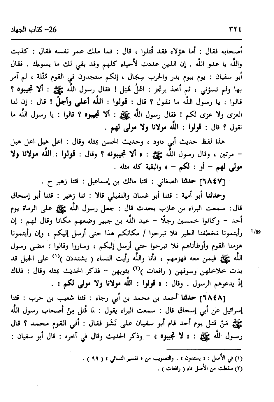 6847 - حَدَّثَنَا الصَّغَانِيُّ، قثنا مَالِكُ بْنُ إِسْمَاعِيلَ، قثنا زُهَيْرٌ، ح وَحَدَّثَنَا أَبُو أُمَيَّةَ، قثنا أَبُو غَسَّانَ، وَالنُّفَيْلِيُّ، قَالَا: ثنا زُهَيْرٌ، قثنا أَبُو إِسْحَاقَ، قَالَ: سَمِعْتُ الْبَرَاءَ بْنَ عَازِبٍ يُحَدِّثُ، قَالَ: §جَعَلَ رَسُولُ اللَّهِ صَلَّى اللهُ عَلَيْهِ وَسَلَّمَ عَلَى الرُّمَاةِ يَوْمَ أُحُدٍ، وَكَانُوا خَمْسِينَ رَجُلًا عَبْدَ اللَّهِ بْنَ جُبَيْرٍ وَضَعَهُمْ مَكَانًا، وَقَالَ لَهُمْ: «إِنْ رَأَيْتُمُونَا تَخْطَفُنَا الطَّيْرُ فَلَا تَبْرَحُوا مَكَانَكُمْ هَذَا حَتَّى أُرْسِلَ إِلَيْكُمْ، وَإِنْ رَأَيْتُمُونَا هَزَمْنَا الْقَوْمَ وَأَوْطَأْنَاهُمْ فَلَا تَبْرَحُوا حَتَّى أُرْسِلَ إِلَيْكُمْ» وَسَارُوا، وَقَالُوا: مَضَى رَسُولُ اللَّهِ صَلَّى اللهُ عَلَيْهِ وَسَلَّمَ فِيمَنْ مَعَهُ فَهَزَمَهُمْ، فَأَنَا وَاللَّهِ رَأَيْتُ النِّسَاءَ يَشْتَدِدْنَ عَلَى الْجَبَلِ قَدْ بَدَتْ خَلَاخِلُهُنَّ وَسُوقُهُنَّ رَافِعَاتٍ بِثَوْبِهِنَّ، فَذَكَرَ الْحَدِيثَ بِمِثْلِهِ، وَقَالَ: فَذَاكَ إِذْ يَدْعُوهُمُ الرَّسُولُ، وَقَالَ: «قُولُوا اللَّهُ مَوْلَانَا وَلَا مَوْلَى لَكُمْ»