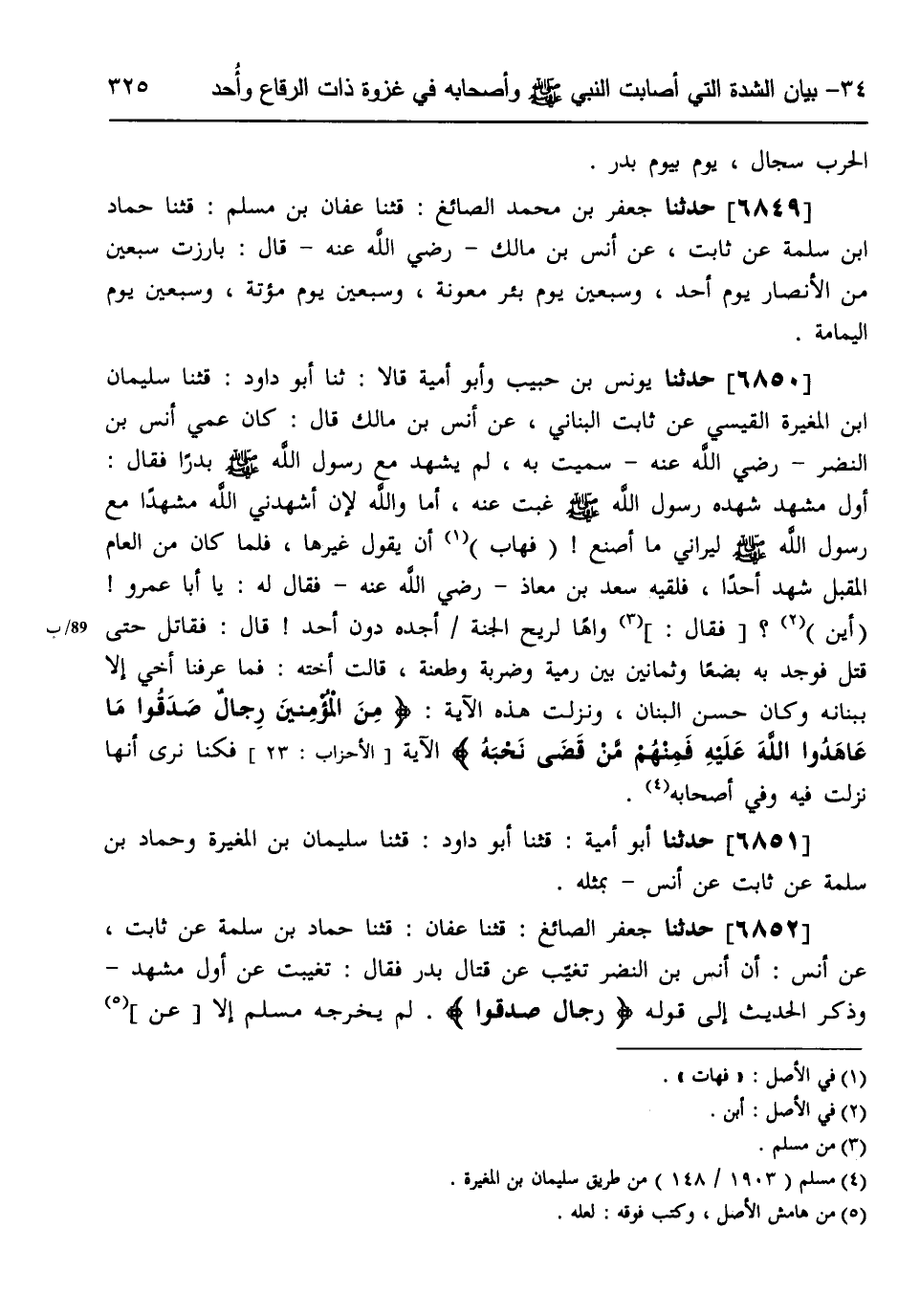 6852 - حَدَّثَنَا جَعْفَرٌ الصَّائِغُ، قثنا عَفَّانُ، قثنا حَمَّادُ بْنُ سَلَمَةَ، عَنْ ثَابِتٍ، عَنْ أَنَسٍ، أَنَّ أَنَسَ بْنَ النَّضْرِ تَغَيَّبَ عَنْ قِتَالِ بَدْرٍ، فَقَالَ: تَغَيَّبْتُ عَنْ أَوَّلِ مَشْهَدٍ، وَذَكَرَ الْحَدِيثَ إِلَى قَوْلِهِ: {رِجَالٌ صَدَقُوا} [الأحزاب: 23] لَمْ يُخَرِّجْهُ مُسْلِمٌ إِلَّا عَنْ -[326]- سُلَيْمَانَ بْنِ الْمُغِيرَةِ فَقَطْ