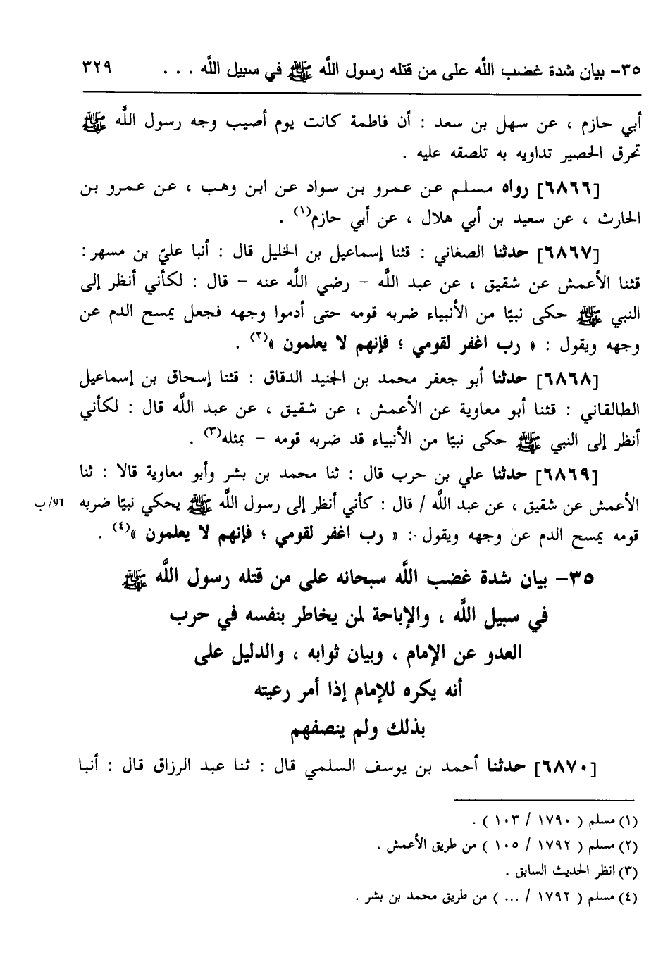 6869 - حَدَّثَنَا عَلِيُّ بْنُ حَرْبٍ، قَالَ: ثنا مُحَمَّدُ بْنُ بِشْرٍ، وَأَبُو مُعَاوِيَةَ، قَالَا: ثنا الْأَعْمَشُ، عَنْ شَقِيقٍ، عَنْ عَبْدِ اللَّهِ، قَالَ: كَأَنِّي أَنْظُرُ إِلَى رَسُولِ اللَّهِ صَلَّى اللهُ عَلَيْهِ وَسَلَّمَ §يَحْكِي: نَبِيًّا ضَرَبَهُ قَوْمُهُ يَمْسَحُ الدَّمَ عَنْ وَجْهِهِ، وَيَقُولُ: «رَبِّ اغْفِرْ لِقَوْمِي فَإِنَّهُمْ لَا يَعْلَمُونَ»