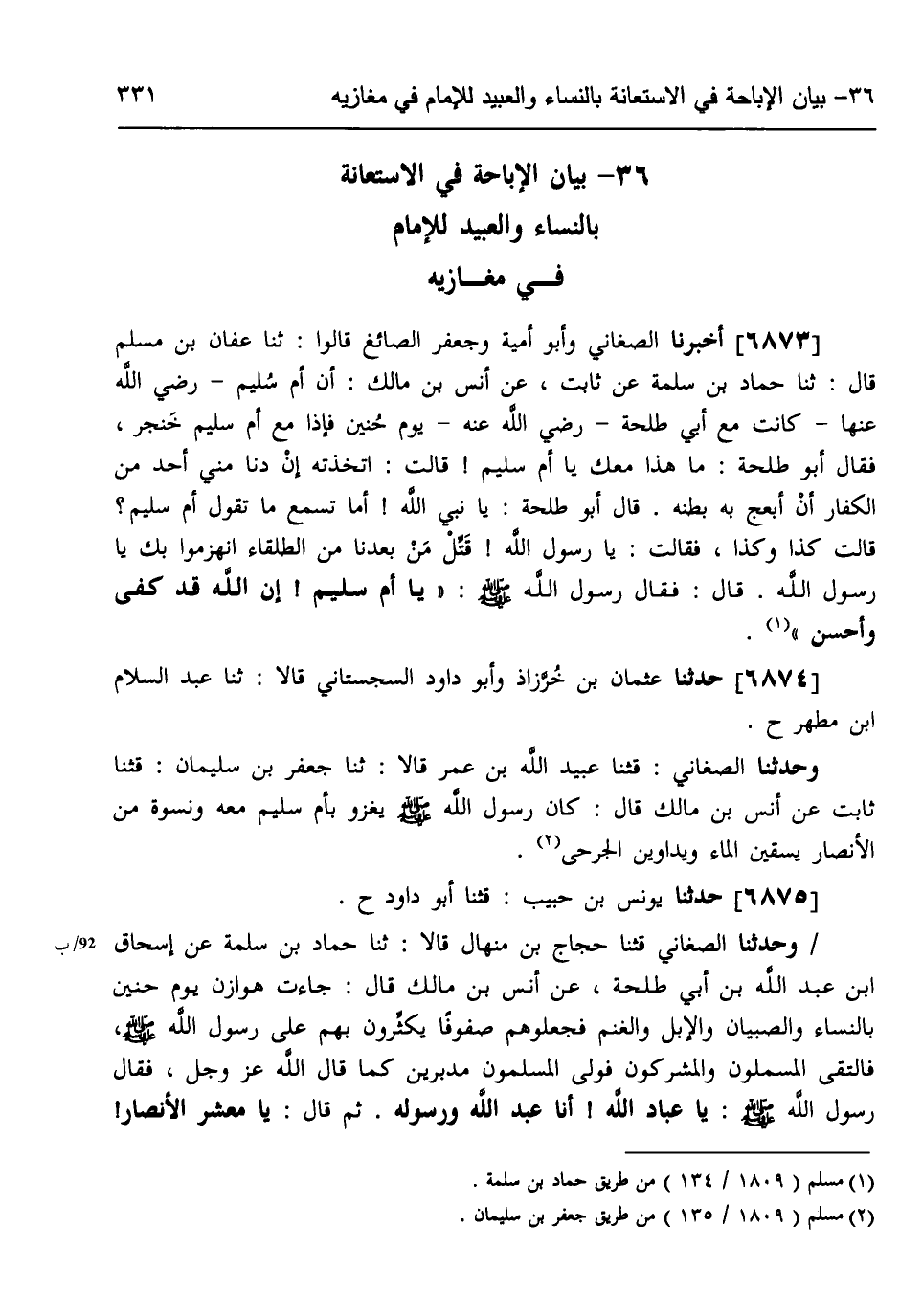 6873 - أَخْبَرَنَا الصَّغَانِيُّ، وَأَبُو أُمَيَّةَ، وَجَعْفَرٌ الصَّائِغُ، قَالُوا: ثنا عَفَّانُ بْنُ مُسْلِمٍ، قَالَ: ثنا حَمَّادُ بْنُ سَلَمَةَ، عَنْ ثَابِتٍ، عَنْ أَنَسِ بْنِ مَالِكٍ: أَنَّ أُمَّ سُلَيْمٍ، رَضِيَ اللَّهُ عَنْهَا، كَانَتْ مَعَ أَبِي طَلْحَةَ رَضِيَ اللَّهُ عَنْهُ يَوْمَ حُنَيْنٍ فَإِذَا مَعَ أُمِّ سُلَيْمٍ خِنْجَرٌ، فَقَالَ أَبُو طَلْحَةَ: مَا هَذَا مَعَكِ يَا أُمَّ سُلَيْمٍ، قَالَتْ: اتَّخَذْتُهُ إِنْ دَنَا مِنِّي أَحَدٌ مِنَ الْكُفَّارِ أَنْ أَبْعَجَ بِهِ بَطْنَهُ، قَالَ أَبُو طَلْحَةَ: يَا نَبِيَّ اللَّهِ أَمَا تَسْمَعُ مَا تَقُولُ أُمُّ سُلَيْمٍ قَالَتْ كَذَا وَكَذَا، فَقَالَتْ: يَا رَسُولَ اللَّهِ قُتِلَ مَنْ بَعْدَنَا مِنَ الطُّلَقَاءِ، انْهَزَمُوا بِكَ يَا رَسُولَ اللَّهِ، قَالَ: فَقَالَ رَسُولُ اللَّهِ صَلَّى اللهُ عَلَيْهِ وَسَلَّمَ: «يَا أُمَّ سُلَيْمٍ إِنَّ §اللَّهَ قَدْ كَفَى وَأَحْسَنَ»