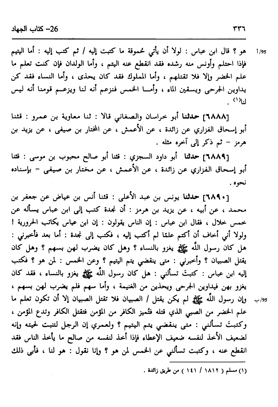 6890 - حَدَّثَنَا يُونُسُ بْنُ عَبْدِ الْأَعْلَى، قثنا أَنَسُ بْنُ عِيَاضٍ، عَنْ جَعْفَرِ بْنِ مُحَمَّدٍ، عَنْ أَبِيهِ، عَنْ يَزِيدَ بْنِ هُرْمُزَ، أَنَّ نَجْدَةَ، كَتَبَ إِلَى ابْنِ عَبَّاسٍ يَسْأَلُهُ عَنْ خَمْسِ خِلَالٍ، فَقَالَ ابْنُ عَبَّاسٍ: إِنَّ النَّاسَ يَقُولُونَ إِنَّ ابْنَ عَبَّاسٍ يُكَاتِبُ الْحَرُورِيَّةَ، وَلَوْلَا أَنِّي أَخَافُ أَنْ أَكْتُمَ عِلْمًا لَمْ أَكْتُبْ إِلَيْهِ، فَكَتَبَ إِلَى نَجْدَةَ: أَمَّا بَعْدُ فَأَخْبِرْنِي §هَلْ كَانَ رَسُولُ اللَّهِ صَلَّى اللهُ عَلَيْهِ وَسَلَّمَ يَغْزُو بِالنِّسَاءِ؟، وَهَلْ كَانَ يَضْرِبُ لَهُنَّ بِسَهْمٍ؟، وَهَلْ كَانَ يَقْتُلُ الصِّبْيَانَ؟، وَأَخْبِرْنِي مَتَى يَنْقَضِي يُتْمُ الْيَتِيمِ؟، وَعَنِ الْخُمُسِ لِمَنْ هُوَ فَكَتَبَ إِلَيْهِ ابْنُ عَبَّاسٍ كَتَبْتَ تَسْأَلُنِي هَلْ كَانَ رَسُولُ اللَّهِ صَلَّى اللهُ عَلَيْهِ وَسَلَّمَ يَغْزُو بِالنِّسَاءِ؟، فَقَدْ كَانَ يَغْزُو بِهِنَّ فَيُدَاوِينَ الْجَرْحَى وَيُحْذَيْنَ مِنَ الْغَنِيمَةِ، وَأَمَّا سَهْمٌ فَلَمْ يَضْرِبْ لَهُنَّ بِسَهْمٍ، وَإِنَّ رَسُولَ اللَّهِ صَلَّى اللهُ عَلَيْهِ وَسَلَّمَ لَمْ يَكُنْ يَقْتُلُ الصِّبْيَانَ فَلَا تَقْتُلِ الصِّبْيَانَ إِلَّا أَنْ تَكُونَ تَعْلَمُ مَا عَلِمَ الْخَضِرُ مِنَ الصَّبِيِّ الَّذِي قَتَلَهُ فَتُمَيِّزُ الْكَافِرَ مِنَ الْمُؤْمِنِ فَتَقْتُلَ الْكَافِرَ وَتَدَعُ الْمُؤْمِنَ، وَكَتَبْتَ تَسْأَلُنِي مَتَى يَنْقَضِي يُتْمُ الْيَتِيمِ؟، وَلَعَمْرِي إِنَّ الرَّجُلَ لَتَنْبُتُ لِحْيَتُهُ وَإِنَّهُ لَضَعِيفُ الْأَخْذِ لِنَفْسِهِ ضَعِيفُ الْإِعْطَاءِ فَإِذَا أَخَذَ لِنَفْسِهِ مِنْ صَالِحِ مَا يَأْخُذُ النَّاسُ، فَقَدِ انْقَطَعَ عَنْهُ، وَكَتَبْتَ تَسْأَلُنِي عَنِ الْخُمُسِ لِمَنْ هُوَ؟، وَإِنَّا نَقُولُ هُوَ لَنَا فَأَبَى ذَلِكَ -[337]- عَلَيْنَا قَوْمُنَا " أَخْبَرَنَا يُونُسُ قَالَ: أَنَا ابْنُ وَهْبٍ قَالَ: عَنْ أَنَسِ بْنِ عِيَاضٍ بِمِثْلِهِ