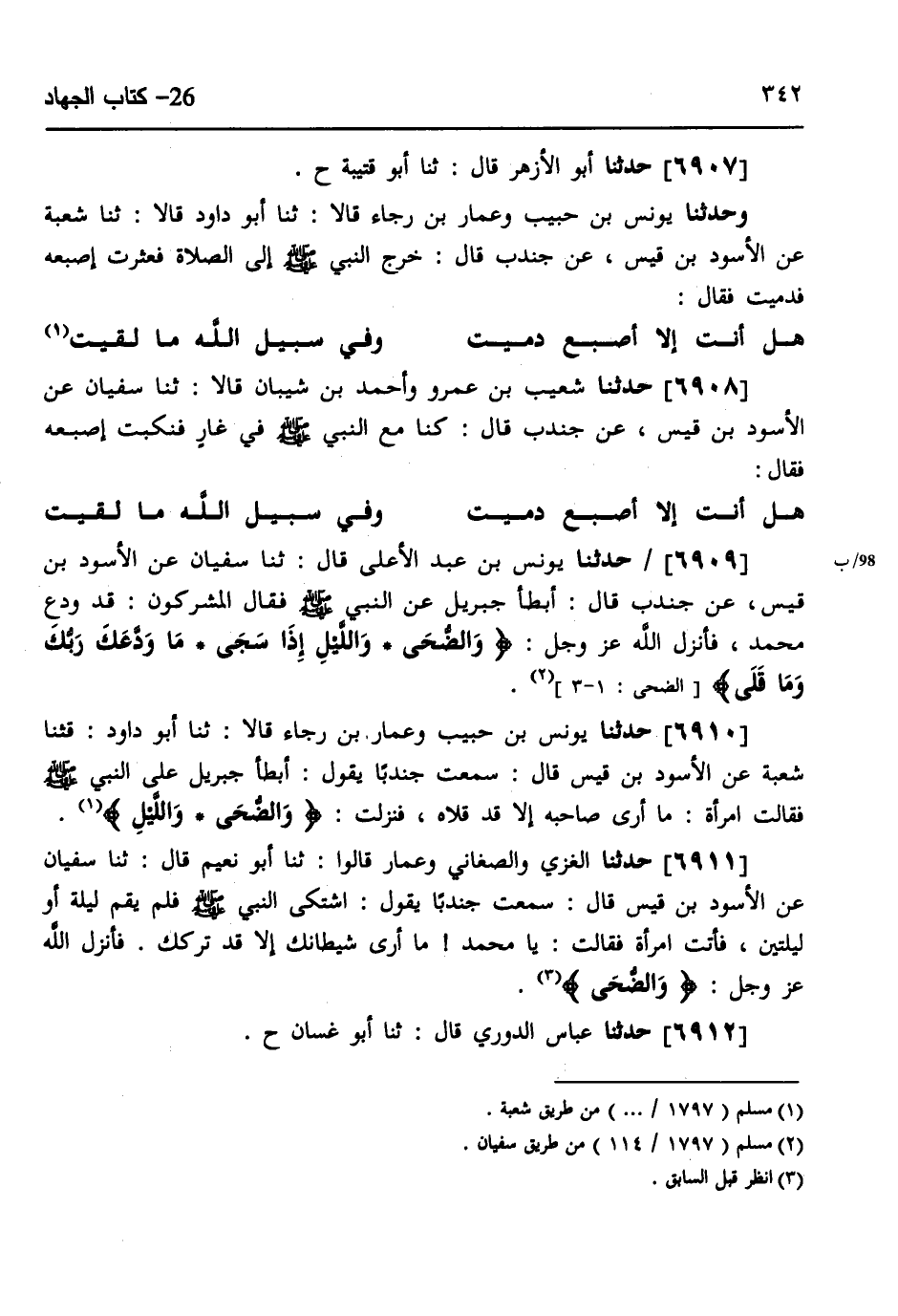6908 - حَدَّثَنَا شُعَيْبُ بْنُ عَمْرٍو، وَأَحْمَدُ بْنُ شَيْبَانَ، قَالَا: ثنا سُفْيَانُ، عَنِ الْأَسْوَدِ بْنِ قَيْسٍ، عَنْ جُنْدُبٍ، قَالَ: §كُنَّا مَعَ النَّبِيِّ صَلَّى اللهُ عَلَيْهِ وَسَلَّمَ فِي غَارٍ فَنُكِبَتْ إِصْبَعُهُ، فَقَالَ: «هَلْ أَنْتِ إِلَّا أَصْبُعٌ دَمِيتِ، وَفِي سَبِيلِ اللَّهِ مَا لَقِيتِ»
