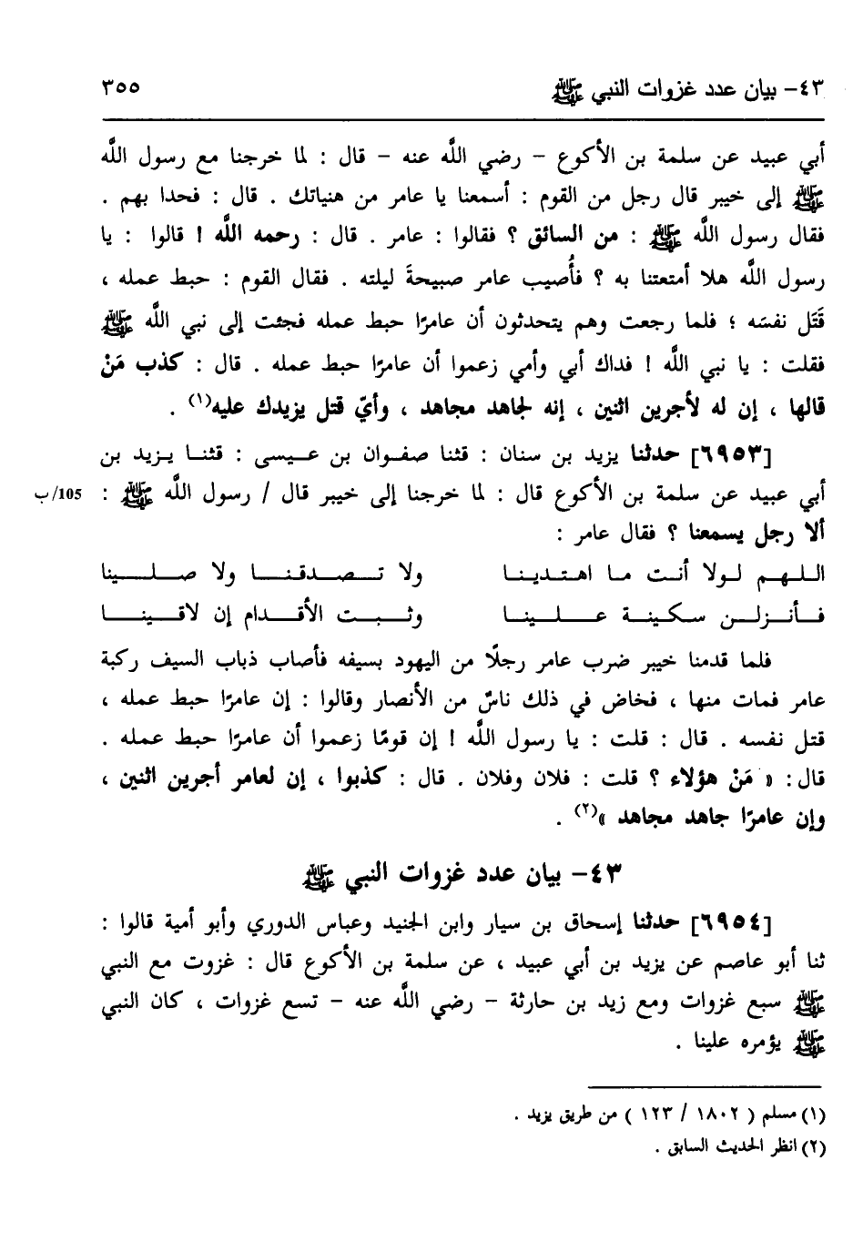 6953 - حَدَّثَنَا يَزِيدُ بْنُ سِنَانٍ، قثنا صَفْوَانُ بْنُ عِيسَى، قثنا يَزِيدُ بْنُ أَبِي عُبَيْدٍ، عَنْ سَلَمَةَ بْنِ الْأَكْوَعِ، قَالَ: لَمَّا §خَرَجْنَا إِلَى خَيْبَرَ، قَالَ رَسُولُ اللَّهِ صَلَّى اللهُ عَلَيْهِ وَسَلَّمَ: «أَلَا رَجُلٌ يُسْمِعُنَا؟» ، فَقَالَ عَامِرٌ: