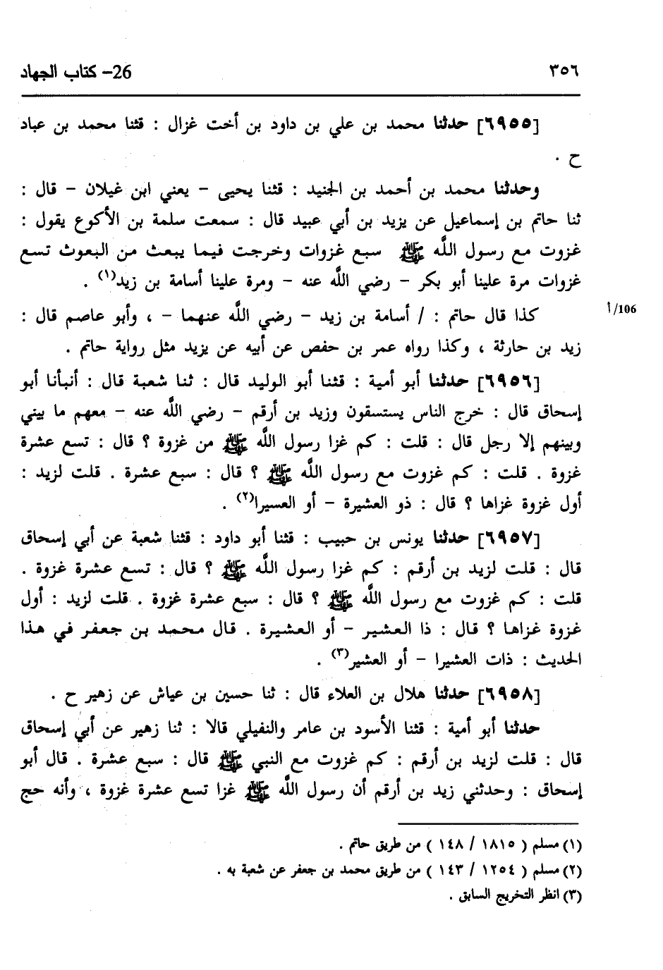 6958 - حَدَّثَنَا هِلَالُ بْنُ الْعَلَاءِ، قَالَ: ثنا حُسَيْنُ بْنُ عَيَّاشٍ، عَنْ زُهَيْرٍ، ح حَدَّثَنَا أَبُو أُمَيَّةَ، قثنا الْأَسْوَدُ بْنُ عَامِرٍ، وَالنُّفَيْلِيُّ، قَالَا: ثنا زُهَيْرٌ، عَنْ أَبِي إِسْحَاقَ، قَالَ: قُلْتُ لِزَيْدِ بْنِ أَرْقَمَ: §كَمْ غَزَوْتَ مَعَ النَّبِيِّ صَلَّى اللهُ عَلَيْهِ وَسَلَّمَ؟، قَالَ: سَبْعَ عَشْرَةَ