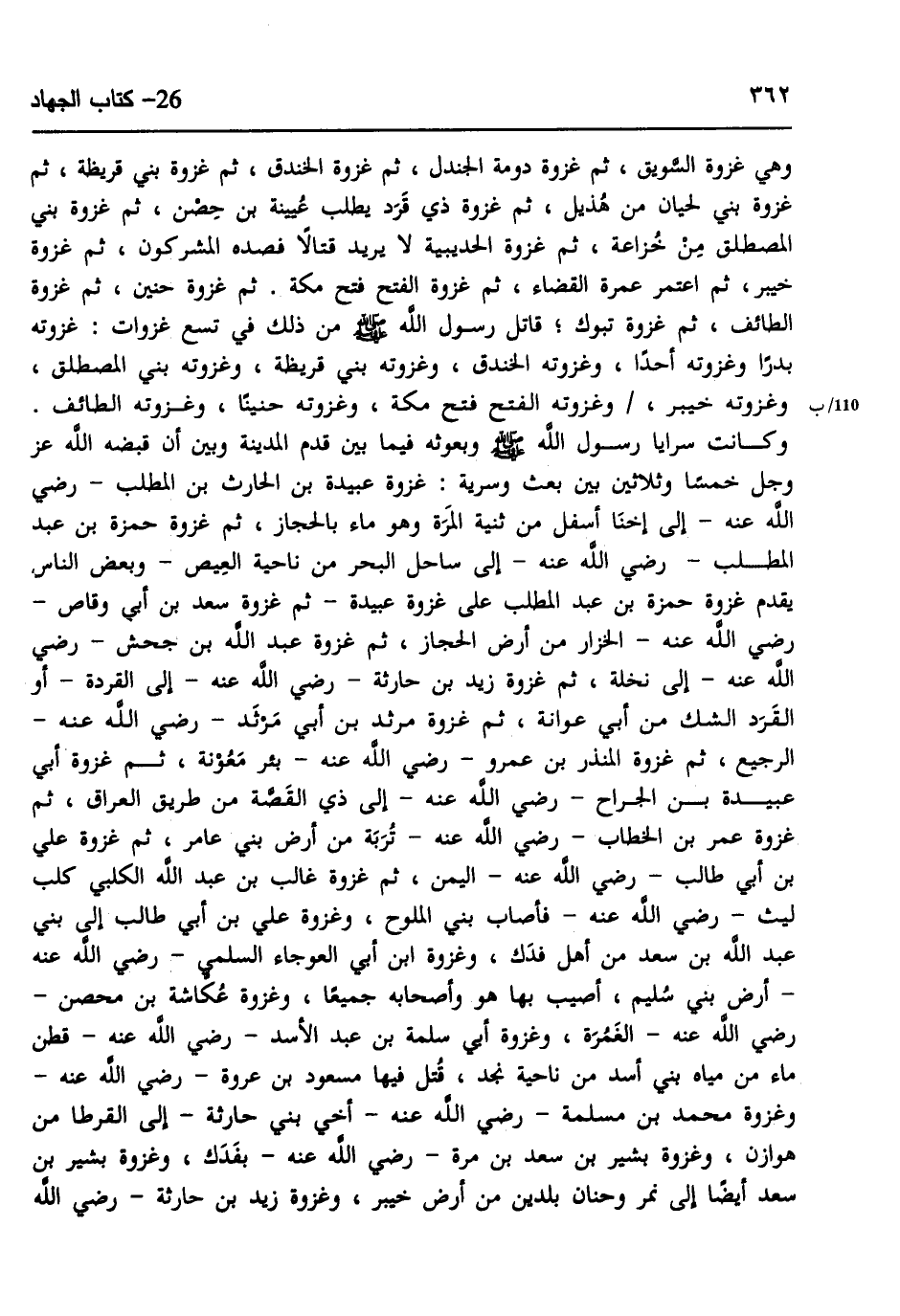 : " §وَكَانَتْ سَرَايَا رَسُولُ اللَّهِ صَلَّى اللهُ عَلَيْهِ وَسَلَّمَ وَبُعُوثُهُ فِيمَا بَيْنَ قَدِمَ الْمَدِينَةَ، وَبَيْنَ أَنْ قَبَضَهُ اللَّهُ عَزَّ وَجَلَّ خَمْسًا وَثَلَاثِينَ، بَيْنَ بَعْثٍ وَسَرِيَّةٍ: غَزْوَةُ عُبَيْدَةَ بْنِ الْحَارِثِ بْنِ الْمُطَّلِبِ رَضِيَ اللَّهُ عَنْهُ إِلَى إخْنَا أَسْفَلَ مِنْ ثَنِيَّةِ الْمَرَّةِ، وَهُوَ مَاءٌ بِالْحِجَازِ، ثُمَّ غَزْوَةُ حَمْزَةَ بْنِ عَبْدِ الْمُطَّلِبِ رَضِيَ اللَّهُ عَنْهُ إِلَى سَاحِلِ الْبَحْرِ مِنْ نَاحِيَةِ الْعِيصِ، وَبَعْضُ النَّاسِ يُقَدِّمُ غَزْوَةَ حَمْزَةَ بْنِ عَبْدِ الْمُطَّلِبِ عَلَى غَزْوَةِ عُبَيْدَةَ، ثُمَّ غَزْوَةُ سَعْدِ بْنِ أَبِي وَقَّاصٍ رَضِيَ اللَّهُ عَنْهُ الْخَزَّارَ مِنْ أَرْضِ الْحِجَازِ، ثُمَّ غَزْوَةُ عَبْدِ اللَّهِ بْنِ جَحْشٍ رَضِيَ اللَّهُ عَنْهُ إِلَى نَخْلَةَ، ثُمَّ غَزْوَةُ زَيْدِ بْنِ حَارِثَةَ رَضِيَ اللَّهُ عَنْهُ إِلَى الْقِرَدَةِ أَوِ الْقَرَدِ، الشَّكُّ مِنْ أَبِي عَوَانَةَ، ثُمَّ غَزْوَةُ مَرْثَدِ بْنِ أَبِي مَرْثَدٍ رَضِيَ اللَّهُ عَنْهُ الرَّجِيعِ، ثُمَّ غَزْوَةُ الْمُنْذِرِ بْنِ عَمْرٍو رَضِيَ اللَّهُ عَنْهُ بِئْرِ مَعُونَةَ، ثُمَّ غَزْوَةُ أَبِي عُبَيْدَةَ بْنِ الْجَرَّاحِ رَضِيَ اللَّهُ عَنْهُ إِلَى ذِي الْقَصَّةِ مِنْ طَرِيقِ الْعِرَاقِ، ثُمَّ غَزْوَةُ عُمَرَ بْنِ الْخَطَّابِ رَضِيَ اللَّهُ عَنْهُ تُرْبَةَ مِنْ أَرْضِ بَنِي عَامِرٍ، ثُمَّ غَزْوَةُ عَلِيِّ بْنِ أَبِي طَالِبٍ رَضِيَ اللَّهُ عَنْهُ الْيَمَنِ، ثُمَّ غَزْوَةُ غَالِبِ بْنِ عَبْدِ اللَّهِ الْكَلْبِيِّ، كَلْبَ لَيْثٍ رَضِيَ اللَّهُ عَنْهُ فَأَصَابَ بَنِي الْمُلَوَّحِ، وَغَزْوَةُ عَلِيِّ بْنِ أَبِي طَالِبٍ إِلَى بَنِي عَبْدِ اللَّهِ بْنِ سَعْدٍ مِنْ أَهْلِ فَدَكَ، وَغَزْوَةُ ابْنُ أَبِي الْعَوْجَاءِ السُّلَمِيُّ رَضِيَ اللَّهُ عَنْهُ أَرْضَ بَنِي سُلَيْمٍ أُصِيبَ بِهَا هُوَ وَأَصْحَابُهُ جَمِيعًا، وَغَزْوَةُ عُكَّاشَةَ بْنِ مِحْصَنٍ رَضِيَ اللَّهُ عَنْهُ الغَمُرَةَ، وَغَزْوَةُ أَبِي سَلَمَةَ بْنِ عَبْدِ الْأَسَدِ رَضِيَ اللَّهُ عَنْهُ قَطَنَ مَاءٍ مِنْ مِيَاهِ بَنِي أَسَدٍ مِنْ نَاحِيَةِ نَجْدٍ قُتِلَ فِيهَا مَسْعُودُ بْنُ عُرْوَةَ رَضِيَ اللَّهُ عَنْهُ، وَغَزْوَةُ مُحَمَّدِ بْنِ مَسْلَمَةَ رَضِيَ اللَّهُ عَنْهُ أَخِي بَنِي حَارِثَةَ إِلَى القُرْطَا مِنْ هَوَازِنَ، وَغَزْوَةُ بَشِيرِ بْنِ سَعْدِ بْنِ مَرَّةَ رَضِيَ اللَّهُ عَنْهُ بِفَدَكَ، وَغَزْوَةُ بَشِيرِ بْنِ سَعْدٍ أَيْضًا إِلَى نَمِرٍ وَحَنَانَ بَلَدَيْنِ مِنْ أَرْضِ خَيْبَرَ، وَغَزْوَةُ زَيْدِ بْنِ حَارِثَةَ رَضِيَ اللَّهُ