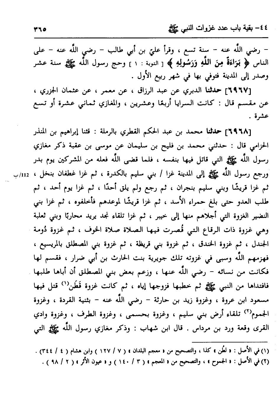6968 - حَدَّثَنَا مُحَمَّدُ بْنُ عَبْدِ الْحَكَمِ الْقَطْرِيُّ، بِالرَّمْلَةِ، قثنا إِبْرَاهِيمُ بْنُ الْمُنْذِرِ الْحِزَامِيُّ، قَالَ: حَدَّثَنِي مُحَمَّدُ بْنُ فُلَيْحِ بْنِ سُلَيْمَانَ، عَنْ مُوسَى بْنِ عُقْبَةَ: ذَكَرَ §مَغَازِي رَسُولِ اللَّهِ صَلَّى اللهُ عَلَيْهِ وَسَلَّمَ الَّتِي قَاتَلَ فِيهَا بِنَفْسِهِ، فَلَمَّا قَضَى اللَّهُ فِعْلَهُ مِنَ الْمُشْرِكِينَ يَوْمَ بَدْرٍ، وَرَجَعَ رَسُولُ اللَّهِ صَلَّى اللهُ عَلَيْهِ وَسَلَّمَ إِلَى الْمَدِينَةِ، غَزَا بَنِي سُلَيْمٍ بِالْكُدْرَةِ، ثُمَّ غَزَا غَطَفَانَ بِنَخْلٍ، ثُمَّ غَزَا قُرَيْشًا وَبَنِي سُلَيْمٍ بِنَجْرَانَ، ثُمَّ رَجَعَ، وَلَمْ يَلْقَ أَحَدًا، ثُمَّ غَزَا يَوْمَ أُحُدٍ، ثُمَّ طَلَبَ الْعَدُوَّ حَتَّى بَلَغَ حَمْرَاءَ الْأَسَدِ، ثُمَّ غَزَا قُرَيْشًا لِمَوْعِدِهِمْ فَأَخْلَفُوهُ، ثُمَّ غَزَا بَنِي النَّضِيرِ الْغَزْوَةَ الَّتِي أَجْلَاهُمْ مِنْهَا إِلَى خَيْبَرَ، ثُمَّ غَزَا تِلْقَاءَ نَجْدٍ يُرِيدُ مُحَارِبًا، وَبَنِي ثَعْلَبَةَ، وَهِيَ غَزْوَةُ ذَاتِ الرِّقَاعِ الَّتِي قُصِرَتْ فِيهَا الصَّلَاةُ صَلَاةُ الْخَوْفِ، ثُمَّ غَزْوَةُ دَوْمَةِ الْجَنْدَلِ، ثُمَّ غَزْوَةُ الْخَنْدَقِ، ثُمَّ غَزْوَةُ بَنِي قُرَيْظَةَ، ثُمَّ غَزْوَةُ بَنِي الْمُصْطَلِقِ بِالْمُرَيْسِيعَ فَهَزَمَهُمُ اللَّهُ وَسَبَى فِي غَزْوَتِهِ تِلْكَ جُوَيْرِيَةَ بِنْتَ الْحَارِثِ بْنِ أَبِي ضِرَارٍ فَقَسَمَ لَهَا فَكَانَتْ مِنْ نِسَائِهِ رَضِيَ اللَّهُ عَنْهَا، وَزَعَمَ بَعْضُ بَنِي الْمُصْطَلِقِ أَنَّ أَبَاهَا طَلَبَهَا فَافْتَدَاهَا مِنَ النَّبِيِّ صَلَّى اللهُ عَلَيْهِ وَسَلَّمَ، ثُمَّ خَطَبَهَا فَزَوَّجَهَا إِيَّاهُ، ثُمَّ كَانَتْ غَزْوَةُ قَطَنٍ قُتِلَ فِيهَا مَسْعُودُ بْنُ عُرْوَةَ، وَغَزْوَةُ زَيْدِ بْنِ حَارِثَةَ رَضِيَ اللَّهُ عَنْهُ بِثَنِيَّةِ الْقِرَدَةَ، وَغَزْوَةُ الْجَمُومِ تِلْقَاءَ أَرْضِ بَنِي سُلَيْمٍ، وَغَزْوَةُ بَحَسْمَى، وَغَزْوَةُ الطَّرْفِ، وَغَزْوَةُ وَادِي الْقُرَى وَقْعَةُ وَرْدِ بْنِ مِرْدَاسٍ، قَالَ ابْنُ شِهَابٍ: وَذَكَرَ مَغَازِي رَسُولِ اللَّهِ صَلَّى اللهُ عَلَيْهِ وَسَلَّمَ الَّتِي -[366]- قَاتَلَ فِيهَا يَوْمَ بَدْرٍ فِي رَمَضَانَ سَنَةَ ثِنْتَيْنِ، ثُمَّ قَاتَلَ أُحُدًا فِي شَوَّالٍ مِنْ سَنَةِ ثَلَاثٍ، ثُمَّ قَاتَلَ يَوْمَ الْخَنْدَقِ، وَهُوَ يَوْمُ الْأَحْزَابِ، وَبَنِي قُرَيْظَةَ فِي شَوَّالٍ سَنَةَ أَرْبَعٍ، ثُمَّ قَاتَلَ بَنِي الْمُصْطَلِقِ وَبَنِي لِحْيَانَ فِي شَعْبَانَ مِنْ سَنَةِ خَمْسٍ، ثُمَّ قَاتَلَ يَوْمَ خَيْبَرَ مِنْ سَنَةِ سِتٍّ، ثُمَّ قَاتَلَ يَوْمَ الْفَتْحِ فِي رَمَضَانَ مِنْ سَنَةِ ثَمَانٍ، ثُمَّ قَاتَلَ يَوْمَ حُنَيْنٍ وَحَصَرَ أَهْلَ الطَّائِفِ فِي شَوَّالٍ سَنَةَ ثَمَانٍ، ثُمَّ حَجَّ أَبُو بَكْرٍ رَضِيَ اللَّهُ عَنْهُ سَنَةَ تِسْعٍ، ثُمَّ حَجَّ رَسُولُ اللَّهِ صَلَّى اللهُ عَلَيْهِ وَسَلَّمَ حَجَّةَ التَّمَامِ سَنَةَ عَشْرٍ