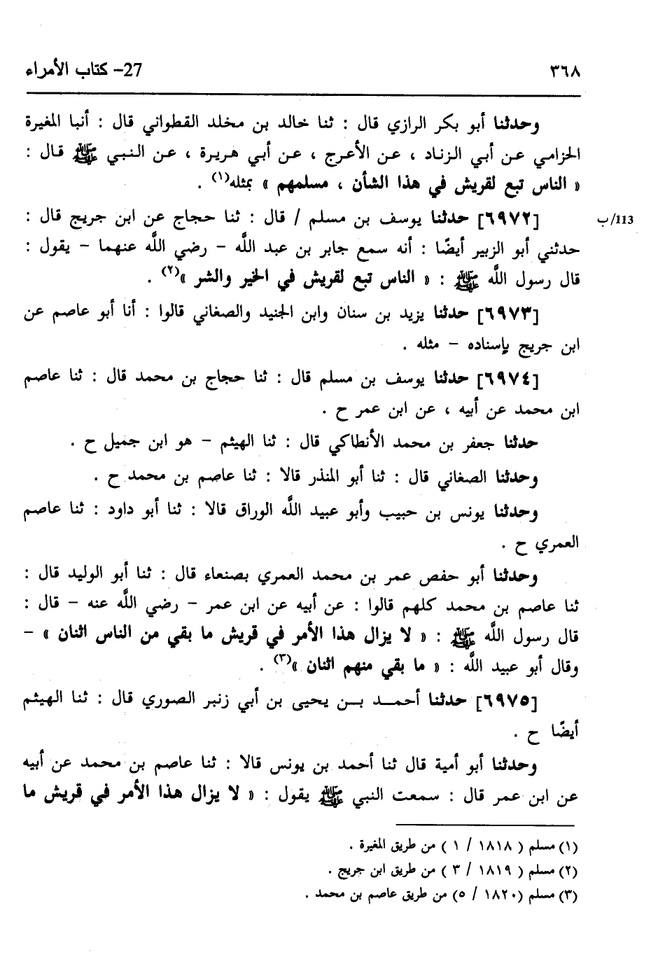 6974 - حَدَّثَنَا يُوسُفُ بْنُ مُسْلِمٍ، قَالَ: ثنا حَجَّاجُ بْنُ مُحَمَّدٍ، قَالَ: ثنا عَاصِمُ بْنُ مُحَمَّدٍ، عَنْ أَبِيهِ، عَنِ ابْنِ عُمَرَ، ح حَدَّثَنَا جَعْفَرُ بْنُ مُحَمَّدٍ الْأَنْطَاكِيُّ، قَالَ: ثنا الْهَيْثَمُ هُوَ ابْنُ جَمِيلٍ ح، وَحَدَّثَنَا الصَّغَانِيُّ، قَالَ: ثنا أَبُو الْمُنْذِرِ، قَالَا: ثنا عَاصِمُ بْنُ مُحَمَّدٍ، ح وَحَدَّثَنَا يُونُسُ بْنُ حَبِيبٍ، وَأَبُو عُبَيْدِ اللَّهِ الْوَرَّاقُ، قَالَا: ثنا أَبُو دَاوُدَ، ثنا عَاصِمٌ الْعُمَرِيُّ، ح وَحَدَّثَنَا أَبُو حَفْصٍ عُمَرُ بْنُ مُحَمَّدٍ الْعُمَرِيُّ بِصَنْعَاءَ، قَالَ: ثنا أَبُو الْوَلِيدِ، قَالَ: ثنا عَاصِمُ بْنُ مُحَمَّدٍ، كُلُّهُمْ، قَالُوا: عَنْ أَبِيهِ، عَنِ ابْنِ عُمَرَ رَضِيَ اللَّهُ عَنْهُ، قَالَ: قَالَ رَسُولُ اللَّهِ صَلَّى اللهُ عَلَيْهِ وَسَلَّمَ: «§لَا يَزَالُ هَذَا الْأَمْرُ فِي قُرَيْشٍ مَا بَقِيَ مِنَ النَّاسِ اثْنَانِ» وَقَالَ أَبُو عُبَيْدِ اللَّهِ: «مَا بَقِيَ مِنْهُمُ اثْنَانِ»