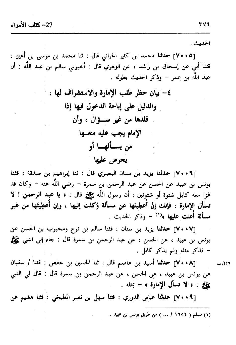 7006 - حَدَّثَنَا يَزِيدُ بْنُ سِنَانٍ الْبَصْرِيُّ، قَالَ: ثنا إِبْرَاهِيمُ بْنُ صَدَقَةَ، قثنا يُونُسُ بْنُ عُبَيْدٍ، عَنِ الْحَسَنِ، عَنْ عَبْدِ الرَّحْمَنِ بْنِ سَمُرَةَ رَضِيَ اللَّهُ عَنْهُ، وَكَانَ قَدْ غَزَا مَعَهُ كَابُلَ شَتْوَةً أَوْ شَتْوَتَيْنِ، أَنَّ رَسُولَ اللَّهِ صَلَّى اللهُ عَلَيْهِ وَسَلَّمَ، قَالَ: «يَا عَبْدَ الرَّحْمَنِ §لَا تَسْأَلِ الْإِمَارَةَ، فَإِنَّكَ إِنْ أُعْطِيتَهَا عَنْ مَسْأَلَةٍ وُكِلْتَ إِلَيْهَا، وَإِنْ أُعْطِيتَهَا مِنْ غَيْرِ مَسْأَلَةٍ أُعِنْتَ عَلَيْهَا» وَذَكَرَ الْحَدِيثَ،