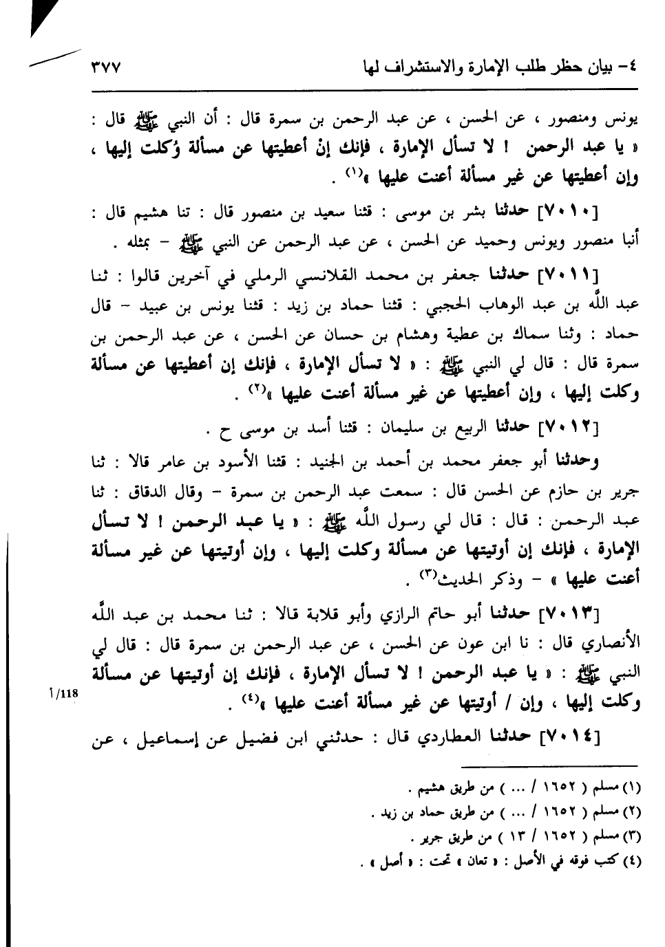 7011 - حَدَّثَنَا جَعْفَرُ بْنُ مُحَمَّدٍ الْقَلَانِسِيُّ الرَّمْلِيُّ، فِي آخَرِينَ، قَالُوا: ثنا عَبْدُ اللَّهِ بْنُ عَبْدِ الْوَهَّابِ الْحَجَبِيُّ، قثنا حَمَّادُ بْنُ زَيْدٍ، قثنا يُونُسُ بْنُ عُبَيْدٍ، قَالَ حَمَّادٌ: وَثَنًا سِمَاكُ بْنُ عَطِيَّةَ، وَهِشَامُ بْنُ حَسَّانَ، عَنِ الْحَسَنِ، عَنْ عَبْدِ الرَّحْمَنِ بْنِ سَمُرَةَ، قَالَ: قَالَ لِي النَّبِيُّ صَلَّى اللهُ عَلَيْهِ وَسَلَّمَ: «§لَا تَسْأَلِ الْإِمَارَةَ فَإِنَّكَ إِنْ أُعْطِيتَهَا عَنْ مَسْأَلَةٍ وُكِلْتَ إِلَيْهَا، وَإِنْ أُعْطِيتَهَا عَنْ غَيْرِ مَسْأَلَةٍ أُعِنْتَ عَلَيْهَا»