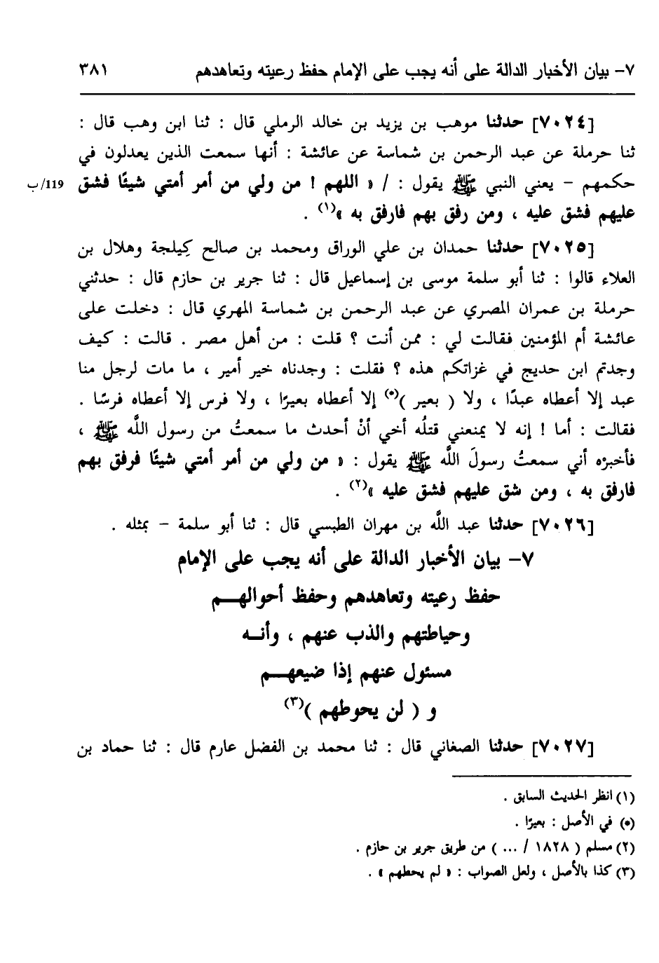7025 - حَدَّثَنَا حَمْدَانُ بْنُ عَلِيٍّ الْوَرَّاقُ، وَمُحَمَّدُ بْنُ صَالِحٍ، كَيْلَجَةَ، وَهِلَالُ بْنُ الْعَلَاءِ، قَالُوا: ثنا أَبُو سَلَمَةَ مُوسَى بْنُ إِسْمَاعِيلَ، قَالَ: ثنا جَرِيرُ بْنُ حَازِمٍ، قَالَ: حَدَّثَنِي حَرْمَلَةُ بْنُ عِمْرَانَ الْمِصْرِيُّ، عَنْ عَبْدِ الرَّحْمَنِ بْنِ شِمَاسَةَ الْمَهْرِيِّ، قَالَ: دَخَلْتُ عَلَى عَائِشَةَ أُمِّ الْمُؤْمِنِينَ، فَقَالَتْ لِي: مِمَّنْ أَنْتَ؟، قُلْتُ: مِنْ أَهْلِ مِصْرَ، قَالَتْ: كَيْفَ وَجَدْتُمُ ابْنَ حُدَيْجٍ فِي غَزَاتِكُمْ هَذِهِ؟، فَقُلْتُ: وَجَدْنَاهُ خَيْرَ أَمِيرٍ، مَا مَاتَ لِرَجُلٍ مِنَّا عَبْدٌ إِلَّا أَعْطَاهُ عَبْدًا، وَلَا بَعِيرٌ إِلَّا أَعْطَاهُ بَعِيرًا وَلَا فَرَسٌ إِلَّا أَعْطَاهُ فَرَسًا، فَقَالَتْ: أَمَا إِنَّهُ لَا يَمْنَعُنِي قَتْلَهُ أَخِي أَنْ أُحَدِّثَ مَا سَمِعْتُ مِنْ رَسُولِ اللَّهِ صَلَّى اللهُ عَلَيْهِ وَسَلَّمَ فَأَخْبِرْهُ أَنِّي سَمِعْتُ رَسُولَ اللَّهِ صَلَّى اللهُ عَلَيْهِ وَسَلَّمَ يَقُولُ: «§مَنْ وَلِيَ مِنْ أَمْرِ أُمَّتِي شَيْئًا فَرَفَقَ بِهِمْ فَارْفُقْ بِهِ، وَمَنْ شَقَّ عَلَيْهِمْ فَشُقَّ عَلَيْهِ» ،
