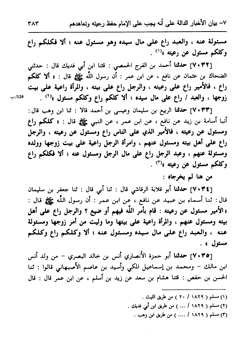 7035 - حَدَّثَنَا أَبُو حَمْزَةَ الْأَنْصَارِيُّ أَنَسُ بْنُ خَالِدٍ الْبَصْرِيُّ مِنْ وَلَدِ أَنَسِ بْنِ مَالِكٍ، وَمُحَمَّدُ بْنُ إِسْمَاعِيلَ الْمَكِّيُّ، وَأُسَيْدُ بْنُ عَاصِمٍ الْأَصْبَهَانِيُّ، قَالُوا: ثنا الْحَسَنُ بْنُ حَفْصٍ، قثنا هِشَامُ بْنُ سَعْدٍ، عَنْ زَيْدِ بْنِ أَسْلَمَ، عَنِ ابْنِ عُمَرَ، قَالَ: قَالَ -[384]- النَّبِيُّ صَلَّى اللهُ عَلَيْهِ وَسَلَّمَ: «§كُلُّكُمْ رَاعٍ وَكُلُّكُمْ مَسْئُولٌ عَنْ رَعِيَّتِهِ فَالْإِمَامُ» ، وَقَالَ بَعْضُهُمْ: «فَالْأَمِيرُ الَّذِي عَلَى النَّاسِ رَاعٍ وَهُوَ مَسْئُولٌ عَنْ رَعِيَّتِهِ، وَالرَّجُلُ رَاعٍ عَلَى أَهْلِهِ مَسْئُولٌ عَنْ رَعِيَّتِهِ، وَالْمَرْأَةُ رَاعِيَةٌ فِي بَيْتِ زَوْجِهَا، وَهِيَ مَسْئُولَةٌ عَنْهُ، فَكُلُّكُمْ رَاعٍ، وَكُلُّكُمْ مَسْئُولٌ عَنْ رَعِيَّتِهِ» قَالَ الْأَنْصَارِيُّ: «وَالْعَبْدُ رَاعٍ عَلَى مَالِ سَيِّدِهِ» ، وَلَمْ يَقُلِ: «الْمَرْأَةُ رَاعِيَةٌ فِي بَيْتِ زَوْجِهَا»