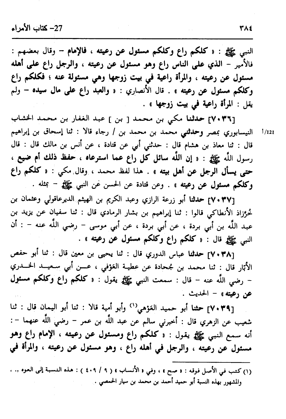 7039 - حثنا أَبُو حُمَيْدٍ الْعَوْهِيُّ، وَأَبُو أُمَيَّةَ، قَالَا: ثنا أَبُو الْيَمَانِ، قَالَ: ثنا شُعَيْبٌ، عَنِ الزُّهْرِيِّ، قَالَ: أَخْبَرَنِي سَالِمٌ، عَنْ عَبْدِ اللَّهِ بْنِ عُمَرَ رَضِيَ اللَّهُ عَنْهُمَا، أَنَّهُ سَمِعَ النَّبِيَّ صَلَّى اللهُ عَلَيْهِ وَسَلَّمَ، يَقُولُ: «§كُلُّكُمْ رَاعٍ، وَمَسْئُولٌ عَنْ رَعِيَّتِهِ، الْإِمَامُ رَاعٍ، وَهُوَ مَسْئُولٌ عَنْ رَعِيَّتِهِ، وَالرَّجُلُ فِي أَهْلِهِ رَاعٍ، وَهُوَ مَسْئُولٌ عَنْ رَعِيَّتِهِ، وَالْمَرْأَةُ فِي -[385]- بَيْتِ زَوْجِهَا رَاعِيَةٌ، وَهِيَ مَسْئُولَةٌ عَنْ رَعِيَّتِهَا، وَالْخَادِمُ فِي مَالِ سَيِّدِهِ رَاعٍ، وَهُوَ مَسْئُولٌ عَنْ رَعِيَّتِهِ» قَالَ: فَسَمِعْتُ هَؤُلَاءِ مِنَ النَّبِيِّ صَلَّى اللهُ عَلَيْهِ وَسَلَّمَ، وَأَحْسَبُ النَّبِيَّ صَلَّى اللهُ عَلَيْهِ وَسَلَّمَ، قَالَ: «وَالرَّجُلُ فِي مَالِ أَبِيهِ رَاعٍ، وَهُوَ مَسْئُولٌ عَنْ رَعِيَّتِهِ فَكُلُّكُمْ رَاعٍ وَكُلُّكُمْ مَسْئُولٌ عَنْ رَعِيَّتِهِ»