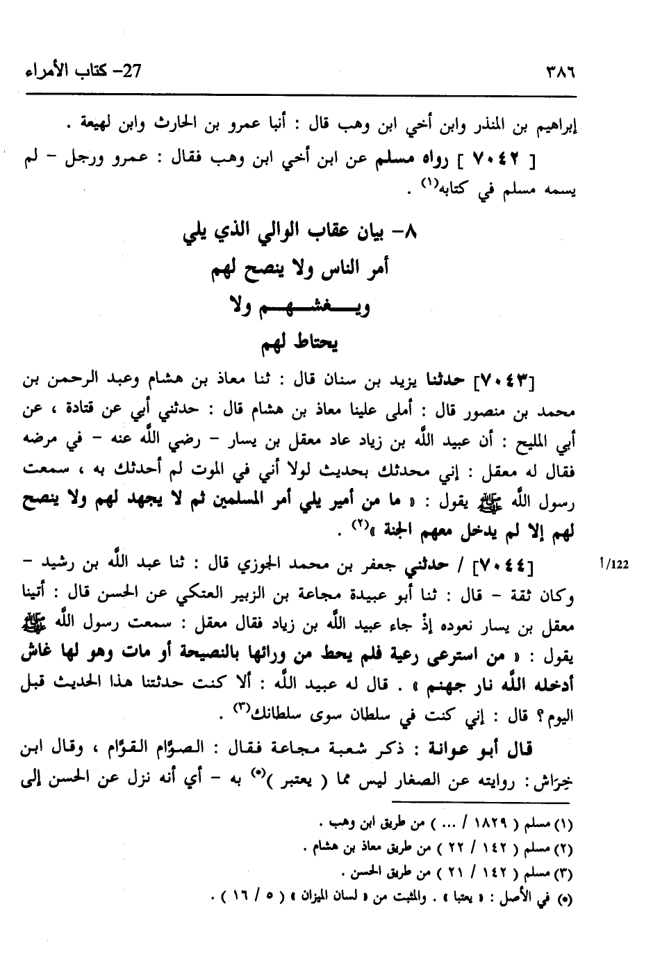 7044 - حَدَّثَنِي جَعْفَرُ بْنُ مُحَمَّدٍ الجَوْزِيُّ، قَالَ: ثنا عَبْدُ اللَّهِ بْنُ رُشَيْدٍ، وَكَانَ ثِقَةً، قَالَ: ثنا أَبُو عُبَيْدَةَ مَجَاعَةُ بْنُ الزُّبَيْرِ الْعَتَكِيُّ، عَنِ الْحَسَنِ، قَالَ: أَتَيْنَا مَعْقِلَ بْنَ يَسَارٍ نَعُودُهُ، إِذْ جَاءَ عُبَيْدُ اللَّهِ بْنُ زِيَادٍ، فَقَالَ مَعْقِلٌ: سَمِعْتُ رَسُولَ اللَّهِ صَلَّى اللهُ عَلَيْهِ وَسَلَّمَ، يَقُولُ: «§مَنِ اسْتَرْعَى رَعِيَّةً، فَلَمْ يُحِطْ مِنْ وَرَائِهَا بالنَّصِيحَةِ، أَوْ مَاتَ، وَهُوَ لَهَا غَاشٌّ أَدْخَلَهُ اللَّهُ نَارَ جَهَنَّمَ» قَالَ لَهُ عُبَيْدُ اللَّهِ: أَلَا كُنْتَ حَدَّثَتْنَا هَذَا الْحَدِيثَ قَبْلَ الْيَوْمِ، قَالَ: إِنِّي كُنْتُ فِي سُلْطَانٍ سِوَى سُلْطَانِكَ قَالَ أَبُو عَوَانَةَ: ذَكَرَ شُعْبَةُ مَجَاعَةَ، فَقَالَ: الصَّوَّامُ الْقَوَّامُ، وَقَالَ ابْنُ خِرَاشٍ: رِوَايَتُهُ عَنِ الصِّغَارِ لَيْسَ مِمَّا يُعْتَبَرُ بِهِ أَيْ أَنَّهُ نَزَلَ عَنِ الْحَسَنِ إِلَى -[387]- مَنْ هُوَ دُونَهُ