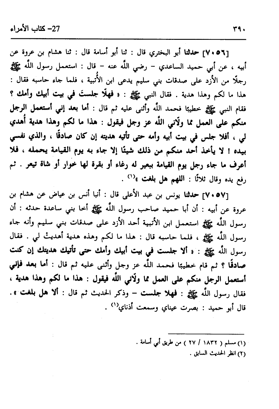 7056 - حَدَّثَنَا أَبُو الْبَخْتَرِيِّ، قَالَ: ثنا أَبُو أُسَامَةَ، قَالَ: ثنا هِشَامُ بْنُ عُرْوَةَ، عَنْ أَبِيهِ، عَنْ أَبِي حُمَيْدٍ السَّاعِدِيِّ رَضِيَ اللَّهُ عَنْهُ، قَالَ: اسْتَعْمَلَ رَسُولُ اللَّهِ صَلَّى اللهُ عَلَيْهِ وَسَلَّمَ رَجُلًا مِنَ الْأَزْدِ عَلَى صَدَقَاتِ بَنِي سُلَيْمٍ يُدْعَى ابْنُ الْأُتْبِيَّةَ، فَلَمَّا جَاءَ حَاسَبَهُ، فَقَالَ: هَذَا مَا لَكُمْ وَهَذَا هَدِيَّةٌ، فَقَالَ النَّبِيُّ صَلَّى اللهُ عَلَيْهِ وَسَلَّمَ: «فَهَلَّا جَلَسْتَ فِي بَيْتِ أَبِيكَ وَأُمِّكَ» ، فَقَامَ النَّبِيُّ صَلَّى اللهُ عَلَيْهِ وَسَلَّمَ خَطِيبًا فَحَمِدَ اللَّهَ وَأَثْنَى عَلَيْهِ، ثُمَّ قَالَ: " أَمَّا بَعْدُ إِنِّي §أَسْتَعْمِلُ الرَّجُلَ مِنْكُمْ عَلَى الْعَمَلِ مِمَّا وَلَّانِي اللَّهُ عَزَّ وَجَلَّ، فَيَقُولُ: هَذَا مَا لَكُمْ وَهَذَا هَدِيَّةٌ أُهْدِيَ لِي، أَفَلَا جَلَسَ فِي بَيْتِ أَبِيهِ وَأُمِّهِ حَتَّى تَأْتِيَهُ هَدِيَّتُهُ إِنْ كَانَ صَادِقًا، وَالَّذِي نَفْسِي بِيَدِهِ لَا يَأْخُذُ أَحَدٌ مِنْكُمْ مِنْ ذَلِكَ شَيْئًا إِلَّا جَاءَ بِهِ يَوْمَ الْقِيَامَةِ يَحْمِلُهُ فَلَا أَعْرِفُ مَا جَاءَ رَجُلٌ يَوْمَ الْقِيَامَةِ بِبَعِيرٍ لَهُ رُغَاءٌ، أَوْ بَقَرَةٍ لَهَا خُوَارٌ، أَوْ شَاةٍ تَيْعَرُ "، ثُمَّ رَفَعَ يَدَهُ، وَقَالَ ثَلَاثًا: «اللَّهُمَّ هَلْ بَلَّغْتُ»