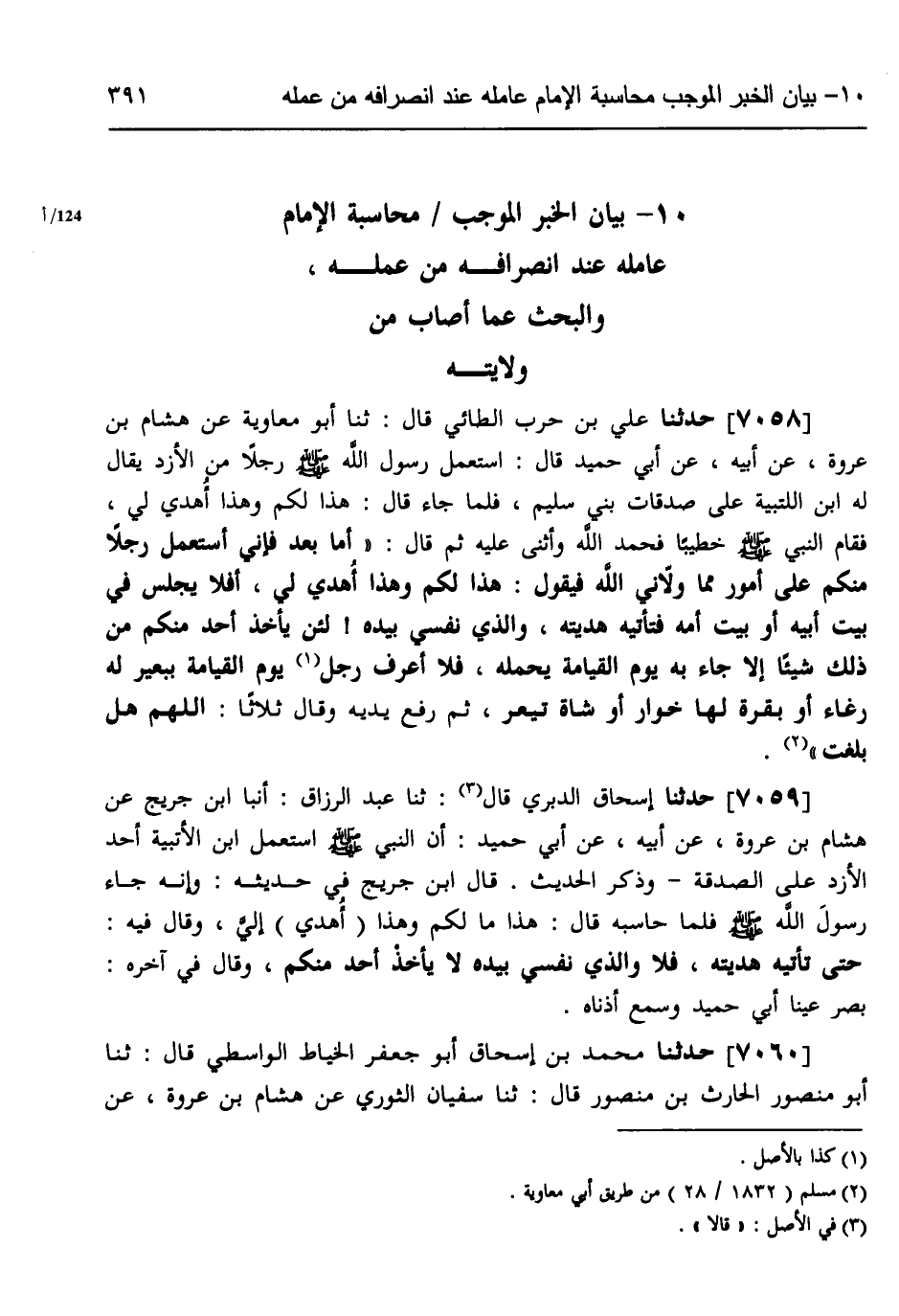 7058 - حَدَّثَنَا عَلِيُّ بْنُ حَرْبٍ الطَّائِيُّ، قَالَ: ثنا أَبُو مُعَاوِيَةَ، عَنْ هِشَامِ بْنِ عُرْوَةَ، عَنْ أَبِيهِ، عَنْ أَبِي حُمَيْدٍ، قَالَ: اسْتَعْمَلَ رَسُولُ اللَّهِ صَلَّى اللهُ عَلَيْهِ وَسَلَّمَ رَجُلًا مِنَ الْأَزْدِ يُقَالُ لَهُ ابْنُ اللُّتْبِيَّةَ عَلَى صَدَقَاتِ بَنِي سُلَيْمٍ، فَلَمَّا جَاءَ، قَالَ: هَذَا لَكُمْ وَهَذَا أُهْدِيَ لِي، فَقَامَ النَّبِيُّ صَلَّى اللهُ عَلَيْهِ وَسَلَّمَ خَطِيبًا فَحَمِدَ اللَّهَ، وَأَثْنَى عَلَيْهِ، ثُمَّ قَالَ: «أَمَّا بَعْدُ فَإِنِّي §أَسْتَعْمِلُ رَجُلًا مِنْكُمْ عَلَى أُمُورٍ مِمَّا وَلَّانِي اللَّهُ، فَيَقُولُ هَذَا لَكُمْ وَهَذَا أُهْدِيَ لِي، أَفَلَا يَجْلِسُ فِي بَيْتِ أَبِيهِ أَوْ بَيْتِ أُمِّهِ فَتَأْتِيهِ هَدِيَّتُهُ، وَالَّذِي نَفْسِي بِيَدِهِ لَئِنْ يَأْخُذُ أَحَدٌ مِنْكُمْ مِنْ ذَلِكَ شَيْئًا إِلَّا جَاءَ بِهِ يَوْمَ الْقِيَامَةِ يَحْمِلُهُ، فَلَا أَعْرِفُ رَجُلًا يَوْمَ الْقِيَامَةِ بِبَعِيرٍ لَهُ رُغَاءٌ، أَوْ بَقَرَةٍ لَهَا خُوَارٌ، أَوْ شَاةٍ تَيْعَرُ» ، ثُمَّ رَفَعَ يَدَيْهِ، وَقَالَ ثَلَاثًا: «اللَّهُمَّ هَلْ بَلَّغْتُ»