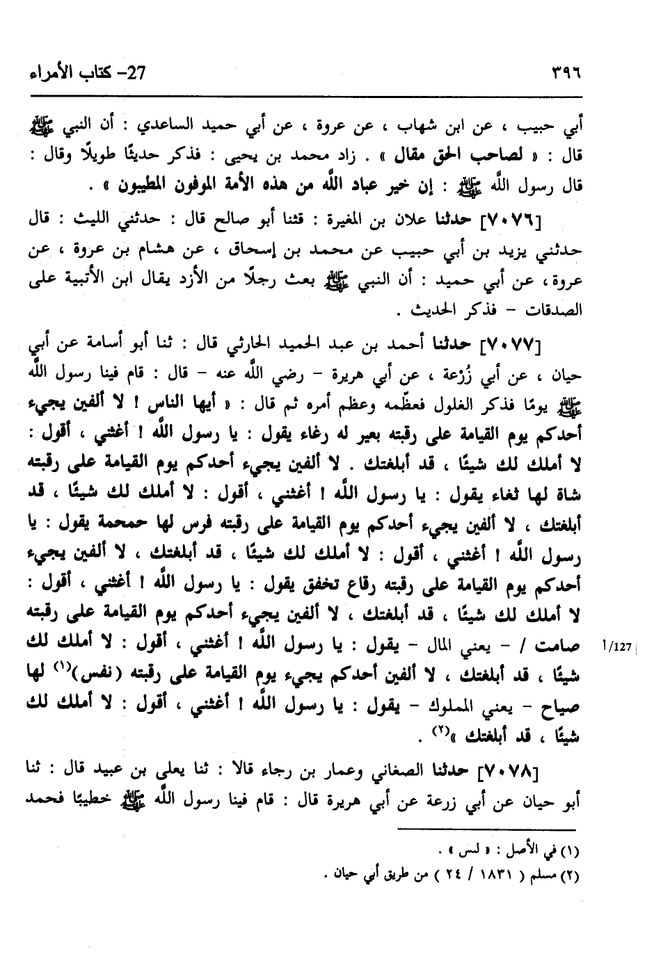 7077 - حَدَّثَنَا أَحْمَدُ بْنُ عَبْدِ الْحَمِيدِ الْحَارِثِيُّ، قَالَ: ثنا أَبُو أُسَامَةَ، عَنْ أَبِي حَيَّانَ، عَنْ أَبِي زُرْعَةَ، عَنْ أَبِي هُرَيْرَةَ رَضِيَ اللَّهُ عَنْهُ، قَالَ: قَامَ فِينَا رَسُولُ اللَّهِ صَلَّى اللهُ عَلَيْهِ وَسَلَّمَ يَوْمًا فَذَكَرَ الْغُلُولَ فَعَظَّمَهُ، وَعَظَّمَ أَمْرَهُ، ثُمَّ قَالَ: " أَيُّهَا النَّاسُ لَا أُلْفِيَنَّ §يَجِيءُ أَحَدُكُمْ يَوْمَ الْقِيَامَةِ عَلَى رَقَبَتِهِ بَعِيرٌ لَهُ رُغَاءٌ، يَقُولُ: يَا رَسُولَ اللَّهِ أَغِثْنِي، أَقُولُ لَا أَمْلِكُ لَكَ شَيْئًا قَدْ أَبْلَغْتُكَ، لَا أُلْفِيَنَّ يَجِيءُ أَحَدُكُمْ يَوْمَ الْقِيَامَةِ عَلَى رَقَبَتِهِ شَاةٌ لَهَا ثُغَاءٌ، يَقُولُ: يَا رَسُولَ اللَّهِ أَغِثْنِي، أَقُولُ: لَا أَمْلِكُ لَكَ شَيْئًا قَدْ أَبْلَغْتُكَ، لَا أُلْفِيَنَّ يَجِيءُ أَحَدُكُمْ يَوْمَ الْقِيَامَةِ عَلَى رَقَبَتِهِ فَرَسٌ لَهَا حَمْحَمَةٌ، يَقُولُ: يَا رَسُولَ اللَّهِ أَغِثْنِي، أَقُولُ لَا أَمْلِكُ لَكَ شَيْئًا قَدْ أَبْلَغْتُكَ، لَا أُلْفِيَنَّ يَجِيءُ أَحَدُكُمْ يَوْمَ الْقِيَامَةِ عَلَى رَقَبَتِهِ رِقَاعٌ تَخْفِقُ، يَقُولُ: يَا رَسُولَ اللَّهِ أَغِثْنِي، أَقُولُ: لَا أَمْلِكُ لَكَ شَيْئًا قَدْ أَبْلَغْتُكَ، لَا أُلْفِيَنَّ يَجِيءُ أَحَدُكُمْ يَوْمَ الْقِيَامَةِ عَلَى رَقَبَتِهِ صَامِتٌ، يَعْنِي الْمَالَ، يَقُولُ: يَا رَسُولَ اللَّهِ أَغِثْنِي، أَقُولُ لَا أَمْلِكُ لَكَ شَيْئًا قَدْ أَبْلَغْتُكَ، لَا أُلْفِيَنَّ أَحَدَكُمْ يَجِيءُ يَوْمَ الْقِيَامَةِ عَلَى رَقَبَتِهِ نَفْسٌ لَهَا صِيَاحٌ، يَعْنِي الْمَمْلُوكَ، يَقُولُ: يَا رَسُولَ اللَّهِ أَغِثْنِي، أَقُولُ: لَا أَمْلِكُ لَكَ شَيْئًا قَدْ أَبْلَغْتُكَ "