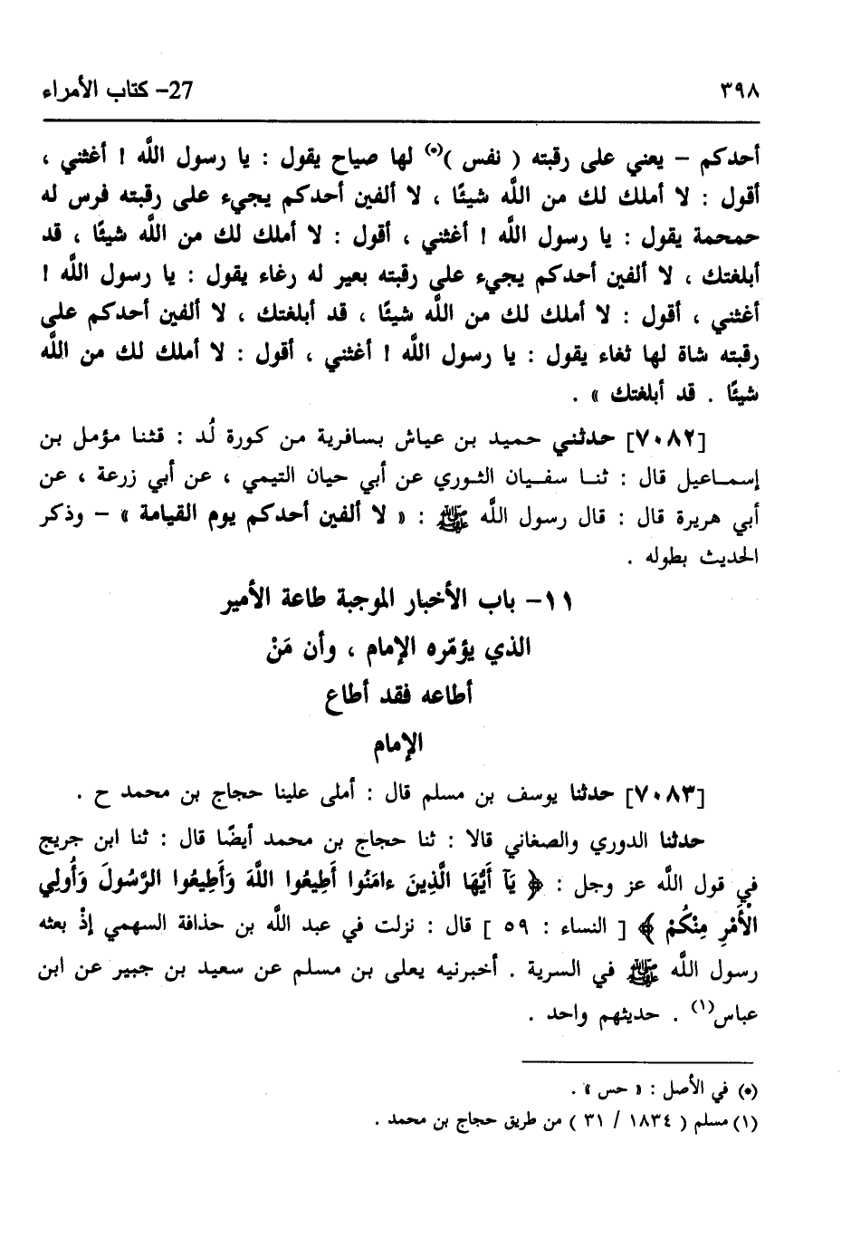 7082 - حَدَّثَنِي حُمَيْدُ بْنُ عَيَّاشٍ، بِسَافِرِيَّةَ مِنْ كُورَةِ لُدٍّ، قثنا مُؤَمَّلُ بْنُ إِسْمَاعِيلَ، قَالَ: ثنا سُفْيَانُ الثَّوْرِيُّ، عَنْ أَبِي حَيَّانَ التَّيْمِيِّ، عَنْ أَبِي زُرْعَةَ، عَنْ أَبِي هُرَيْرَةَ، قَالَ: قَالَ رَسُولُ اللَّهِ صَلَّى اللهُ عَلَيْهِ وَسَلَّمَ: «§لَا أُلْفِيَنَّ أَحَدَكُمْ يَوْمَ الْقِيَامَةِ» ، وَذَكَرَ الْحَدِيثَ بِطُولِهِ