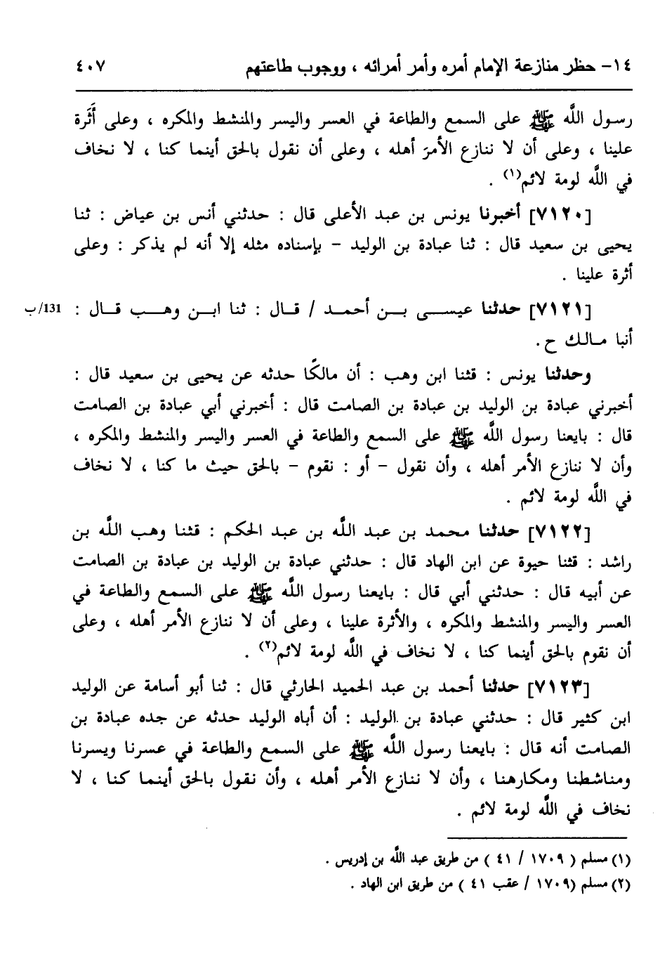 7121 - حَدَّثَنَا عِيسَى بْنُ أَحْمَدَ، قَالَ: ثنا ابْنُ وَهْبٍ، قَالَ: أَنْبَا مَالِكٌ، ح وَحَدَّثَنَا يُونُسُ، قثنا ابْنُ وَهْبٍ، أَنَّ مَالِكًا، حَدَّثَهُ عَنْ يَحْيَى بْنِ سَعِيدٍ، قَالَ: أَخْبَرَنِي عُبَادَةُ بْنُ الْوَلِيدِ بْنِ عُبَادَةَ بْنِ الصَّامِتِ، قَالَ: أَخْبَرَنِي أَبِي عُبَادَةُ بْنُ الصَّامِتِ، قَالَ: «§بَايَعْنَا رَسُولَ اللَّهِ صَلَّى اللهُ عَلَيْهِ وَسَلَّمَ عَلَى السَّمْعِ، وَالطَّاعَةِ فِي الْعُسْرِ، وَالْيُسْرِ، وَالْمَنْشَطِ، وَالْمَكْرَهِ، وَأَنْ لَا نُنَازِعَ الْأَمْرَ أَهْلَهُ، وَأَنْ نَقُولَ أَوْ نَقُومَ بِالْحَقِّ حَيْثُ مَا كُنَّا لَا نَخَافُ فِي اللَّهِ لَوْمَةَ لَائِمٍ»