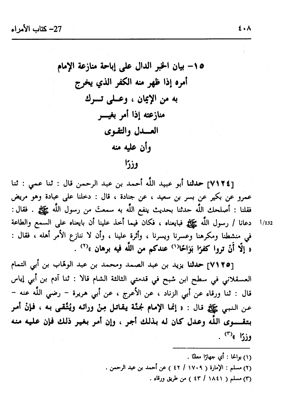 7124 - حَدَّثَنَا أَبُو عُبَيْدِ اللَّهِ أَحْمَدُ بْنُ عَبْدِ الرَّحْمَنِ، قَالَ: ثنا عَمِّي، ثنا عَمْرٌو، عَنْ بُكَيْرٍ، عَنْ بُسْرِ بْنِ سَعِيدٍ، عَنْ جُنَادَةَ، قَالَ: دَخَلْنَا عَلَى عُبَادَةَ وَهُوَ مَرِيضٌ، فَقُلْنَا: أَصْلَحَكَ اللَّهُ، حَدِّثْنَا بِحَدِيثٍ يَنْفَعُ اللَّهُ بِهِ، سَمِعْتَ مِنْ رَسُولِ اللَّهِ صَلَّى اللهُ عَلَيْهِ وَسَلَّمَ، فَقَالَ: دَعَانَا رَسُولُ اللَّهِ صَلَّى اللهُ عَلَيْهِ وَسَلَّمَ فَبَايَعْنَاهُ، فَكَانَ فِيمَا أَخَذَ عَلَيْنَا أَنْ §بَايَعْنَاهُ عَلَى السَّمْعِ، وَالطَّاعَةِ فِي مَنْشَطِنَا، وَمَكْرَهِنَا، وَعُسْرِنَا، وَيُسْرِنَا، وَأَثَرَةٍ عَلَيْنَا، وَأَنْ لَا نُنَازِعَ الْأَمْرَ أَهْلَهُ، فَقَالَ: «إِلَّا أَنْ تَرَوْا كُفْرًا بَوَاحًا عِنْدَكُمْ مِنَ اللَّهِ فِيهِ بُرْهَانٌ»
