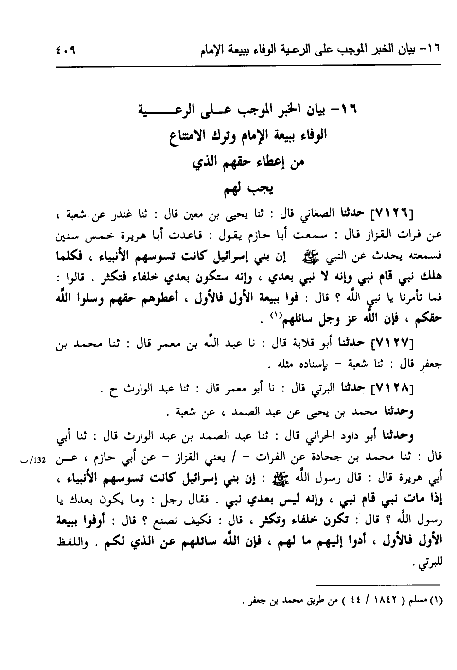 7126 - حَدَّثَنَا الصَّغَانِيُّ، قَالَ: ثنا يَحْيَى بْنُ مَعِينٍ، قَالَ: ثنا غُنْدَرٌ، عَنْ شُعْبَةَ، عَنْ فُرَاتٍ الْقَزَّازِ، قَالَ: سَمِعْتُ أَبَا حَازِمٍ، يَقُولُ: قَاعَدْتُ أَبَا هُرَيْرَةَ خَمْسَ سِنِينَ فَسَمِعْتُهُ يُحَدِّثُ عَنِ النَّبِيِّ صَلَّى اللهُ عَلَيْهِ وَسَلَّمَ: «إِنَّ §بَنِي إِسْرَائِيلَ كَانَتْ تَسُوسُهُمُ الْأَنْبِيَاءُ، فَكُلَّمَا هَلَكَ نَبِيٌّ، قَامَ نَبِيٌّ، وَإِنَّهُ لَا نَبِيَّ بَعْدِي، وَإِنَّهُ سَتَكُونُ بَعْدِي خُلَفَاءُ فَتَكْثُرُ» ، قَالُوا: فَمَا تَأْمُرُنَا يَا نَبِيَّ اللَّهِ؟، قَالَ: «فُوا بِبَيْعَةِ الْأَوَّلِ فَالْأَوَّلِ، أَعْطُوهُمْ حَقَّهُمْ وَسَلُوا اللَّهَ حَقَّكُمْ، فَإِنَّ اللَّهَ عَزَّ وَجَلَّ سَائِلُهُمْ» ،