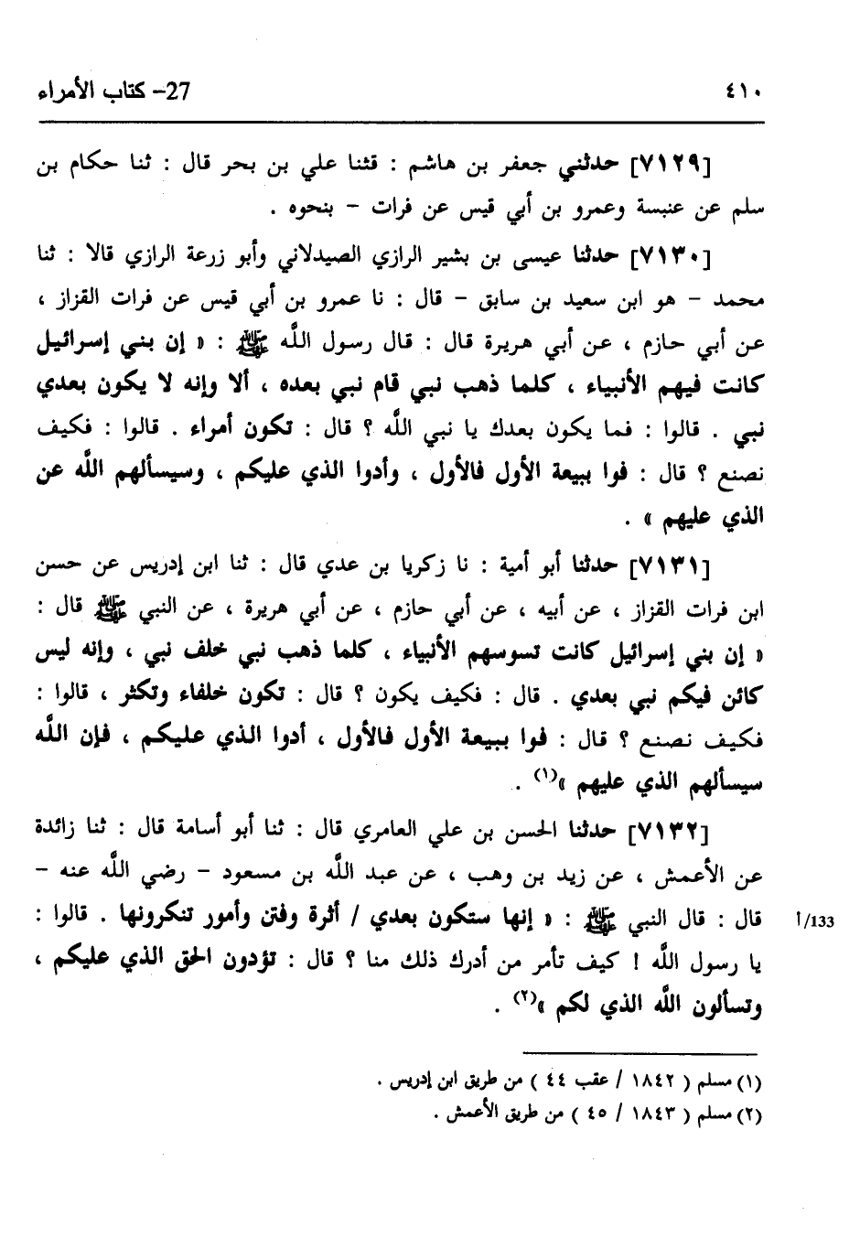 7130 - حَدَّثَنَا عِيسَى بْنُ بَشِيرٍ الرَّازِيُّ الصَّيْدَلَانِيُّ، وَأَبُو زُرْعَةَ الرَّازِيُّ، قَالَا: ثنا مُحَمَّدٌ هُوَ ابْنُ سَعِيدِ بْنِ سَابِقٍ، قَالَ: نا عَمْرُو بْنُ أَبِي قَيْسٍ، عَنْ فُرَاتٍ الْقَزَّازِ، عَنْ أَبِي حَازِمٍ، عَنْ أَبِي هُرَيْرَةَ، قَالَ: قَالَ رَسُولُ اللَّهِ صَلَّى اللهُ عَلَيْهِ وَسَلَّمَ: «إِنَّ §بَنِي إِسْرَائِيلَ كَانَتْ فِيهِمُ الْأَنْبِيَاءُ كُلَّمَا ذَهَبَ نَبِيٌّ قَامَ نَبِيٌّ بَعْدَهُ، أَلَا وَإِنَّهُ لَا يَكُونُ بَعْدِي نَبِيٌّ» ، قَالُوا: فَمَا يَكُونُ بَعْدَكَ يَا نَبِيَّ اللَّهِ؟، قَالَ: «تَكُونُ أُمَرَاءُ» ، قَالُوا: فَكَيْفَ نَصْنَعُ؟، قَالَ: «فُوا بِبَيْعَةِ الْأَوَّلِ فَالْأَوَّلِ، وَأَدُّوا الَّذِي عَلَيْكُمْ وَسَيَسْأَلُهُمُ اللَّهُ عَنِ الَّذِي عَلَيْهِمْ»