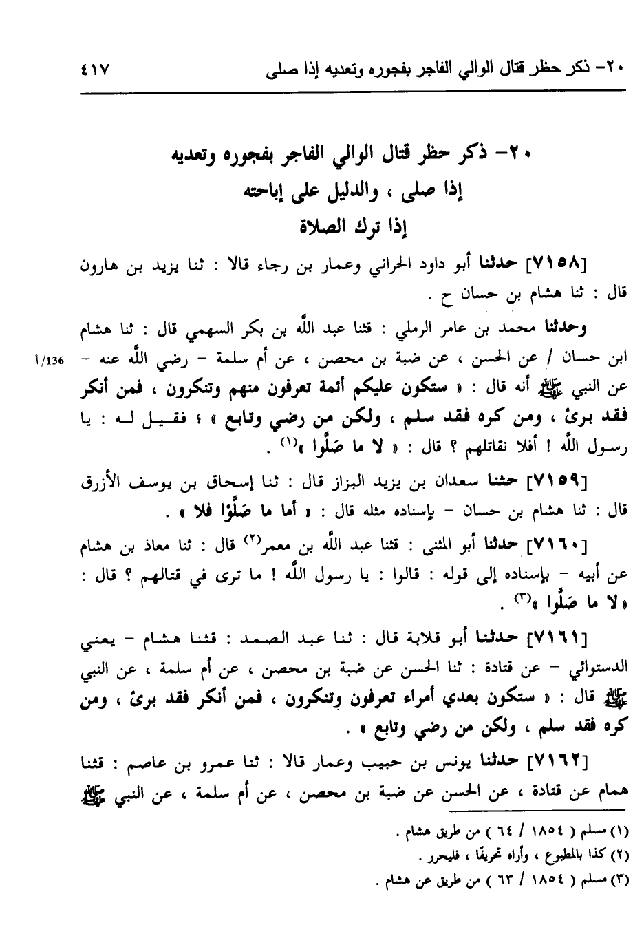 7158 - حَدَّثَنَا أَبُو دَاوُدَ الْحَرَّانِيُّ، وَعَمَّارُ بْنُ رَجَاءٍ، قَالَا: ثنا يَزِيدُ بْنُ هَارُونَ، قَالَ: ثنا هِشَامُ بْنُ حَسَّانَ، ح وَحَدَّثَنَا مُحَمَّدُ بْنُ عَامِرٍ الرَّمْلِيُّ، قثنا عَبْدُ اللَّهِ بْنُ بَكْرٍ السَّهْمِيُّ، قَالَ: ثنا هِشَامُ بْنُ حَسَّانَ، عَنِ الْحَسَنِ، عَنْ ضَبَّةَ بْنِ مِحْصَنٍ، عَنْ أُمِّ سَلَمَةَ رَضِيَ اللَّهُ عَنْهُ، عَنِ النَّبِيِّ صَلَّى اللهُ عَلَيْهِ وَسَلَّمَ أَنَّهُ، قَالَ: «§سَتَكُونُ عَلَيْكُمْ أَئِمَّةٌ تَعْرِفُونَ مِنْهُمْ، وَتُنْكِرُونَ فَمَنْ أَنْكَرَ فَقَدْ بَرِئَ، وَمَنْ كَرِهَ فَقَدْ سَلِمَ وَلَكِنْ مَنْ رَضِيَ وَتَابَعَ» ، فَقِيلَ لَهُ: يَا رَسُولَ اللَّهِ أَفَلَا نُقَاتِلُهُمْ؟، قَالَ: «لَا مَا صَلُّوا» ،
