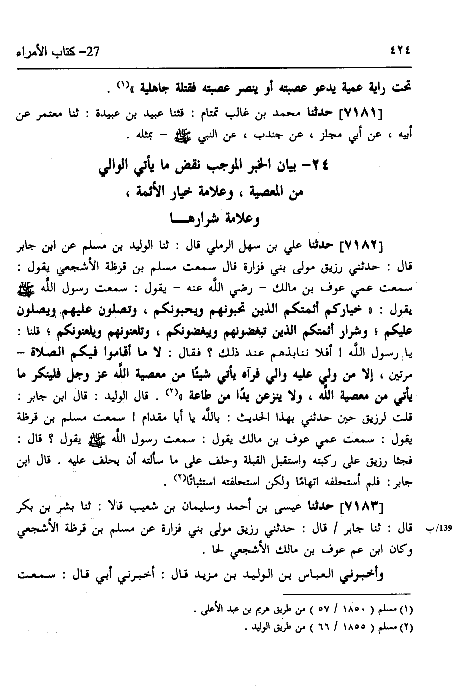 7183 - حَدَّثَنَا عِيسَى بْنُ أَحْمَدَ، وَسُلَيْمَانُ بْنُ شُعَيْبٍ، قَالَا: ثنا بِشْرُ بْنُ بَكْرٍ، قَالَ: ثنا جَابِرٌ، قَالَ: حَدَّثَنِي رُزَيْقٌ، مَوْلَى بَنِي فَزَارَةَ، عَنْ مُسْلِمِ بْنِ قَرَظَةَ الْأَشْجَعِيِّ، وَكَانَ ابْنَ عَمِّ عَوْفِ بْنِ مَالِكٍ الْأَشْجَعِيِّ لَحَا، وَأَخْبَرَنِي الْعَبَّاسُ بْنُ الْوَلِيدِ بْنِ مَزْيَدٍ، قَالَ: أَخْبَرَنِي أَبِي، قَالَ: سَمِعْتُ -[425]- عَبْدَ الرَّحْمَنِ بْنَ يَزِيدَ بْنِ جَابِرٍ، قَالَ: حَدَّثَنِي رُزَيْقٌ، مَوْلَى بَنِي فَزَارَةَ عَنْ مُسْلِمِ بْنِ قَرَظَةَ الْأَشْجَعِيِّ، وَكَانَ ابْنَ عَمِّ عَوْفِ بْنِ مَالِكٍ الْأَشْجَعِيِّ لَحَا، قَالَ: سَمِعْتُ عَوْفَ بْنَ مَالِكٍ، يَقُولُ: سَمِعْتُ رَسُولَ اللَّهِ صَلَّى اللهُ عَلَيْهِ وَسَلَّمَ يَقُولُ: «§خِيَارُ أَئِمَّتِكُمُ الَّذِينَ تُحِبُّونَهُمْ وَيُحِبُّونَكُمْ، وَتُصَلُّونَ عَلَيْهِمْ وَيُصَلُّونَ عَلَيْكُمْ، وَشِرَارُ أَئِمَّتِكُمُ الَّذِينَ تُبْغِضُونَهُمْ وَيُبْغِضُونَكُمْ، وَتَلْعَنُونَهُمْ وَيَلْعَنُونَكُمْ» ، قُلْنَا: يَا رَسُولَ اللَّهِ أَفَلَا نُنَابِذُهُمْ عِنْدَ ذَلِكَ؟، فَقَالَ: «لَا مَا أَقَامُوا فِيكُمُ الصَّلَاةَ، إِلَّا مَنْ وَلِيَ عَلَيْهِ وَالٍ فَرَآهُ يَأْتِي شَيْئًا مِنْ مَعْصِيَةِ اللَّهِ فَلْيُنْكِرْ مَا يَأْتِي مِنْ مَعْصِيَةِ اللَّهِ، وَلَا يَنْزِعَنَّ يَدًا مِنْ طَاعَةٍ» ،