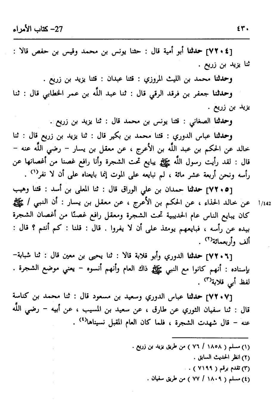7206 - حَدَّثَنَا الدُّورِيُّ، وَأَبُو قِلَابَةَ، قَالَا: ثنا يَحْيَى بْنُ مَعِينٍ، قَالَ: ثنا شَبَابَةُ، بِإِسْنَادِهِ، أَنَّهُمْ §كَانُوا مَعَ النَّبِيِّ صَلَّى اللهُ عَلَيْهِ وَسَلَّمَ ذَاكَ الْعَامَ، وَأَنَّهُمْ أُنْسُوهُ، يَعْنِي مَوْضِعَ الشَّجَرَةِ. لَفْظُ أَبِي قِلَابَةَ