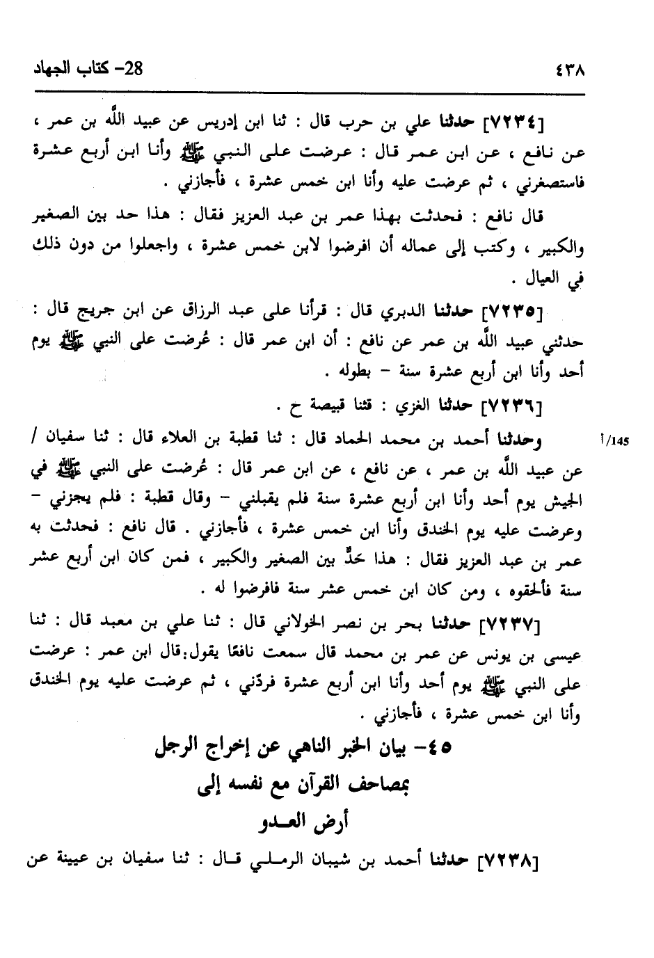 7237 - حَدَّثَنَا بَحْرُ بْنُ نَصْرٍ الْخَوْلَانِيُّ، قَالَ: ثنا عَلِيُّ بْنُ مَعْبَدٍ، قَالَ: ثنا عِيسَى بْنُ يُونُسَ، عَنْ عُمَرَ بْنِ مُحَمَّدٍ، قَالَ: سَمِعْتُ نَافِعًا، يَقُولُ: قَالَ ابْنُ عُمَرَ: «§عُرِضْتُ عَلَى النَّبِيِّ صَلَّى اللهُ عَلَيْهِ وَسَلَّمَ يَوْمَ أُحُدٍ وَأَنَا ابْنُ أَرْبَعَ عَشْرَةَ فَرَدَّنِي، ثُمَّ عُرِضْتُ عَلَيْهِ يَوْمَ الْخَنْدَقِ، وَأَنَا ابْنُ خَمْسَ عَشْرَةَ فَأَجَازَنِي»