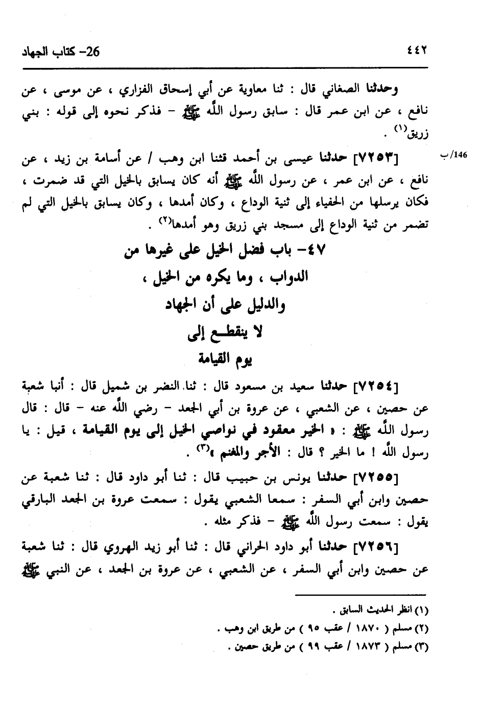 7256 - حَدَّثَنَا أَبُو دَاوُدَ الْحَرَّانِيُّ، قَالَ: ثنا أَبُو زَيْدٍ الْهَرَوِيُّ، قَالَ: ثنا شُعْبَةُ، عَنْ حُصَيْنٍ، وَابْنِ أَبِي السَّفَرِ، عَنِ الشَّعْبِيِّ، عَنْ عُرْوَةَ بْنِ الْجَعْدِ، عَنِ النَّبِيِّ صَلَّى اللهُ عَلَيْهِ وَسَلَّمَ -[443]- قَالَ: «§الْخَيْرُ مَعْقُودٌ بِنَوَاصِي الْخَيْلِ إِلَى يَوْمِ الْقِيَامَةِ الْأَجْرُ وَالْمَغْنَمُ»
