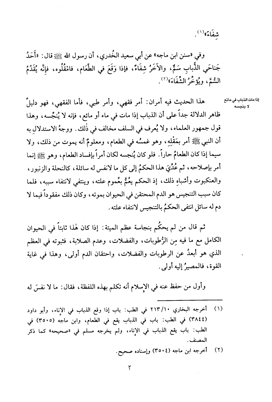 هَذَا الْحَدِيثُ فِيهِ أَمْرَانِ: أَمْرٌ فِقْهِيٌّ، وَأَمْرٌ طِبِّيٌّ، فَأَمَّا الْفِقْهِيُّ فَهُوَ دَلِيلٌ ظَاهِرُ الدَّلَالَةِ جِدًّا عَلَى أَنَّ الذُّبَابَ إِذَا مَاتَ فِي مَاءٍ أَوْ مَائِعٍ فَإِنَّهُ لَا يُنَجِّسُهُ، وَهَذَا قَوْلُ جُمْهُورِ الْعُلَمَاءِ، وَلَا يُعْرَفُ فِي السَّلَفِ مُخَالِفٌ فِي ذَلِكَ. وَوَجْهُ الِاسْتِدْلَالِ بِهِ أَنَّ النَّبِيَّ صَلَّى اللَّهُ عَلَيْهِ وَسَلَّمَ أَمَرَ بِمَقْلِهِ، وَهُوَ غَمْسُهُ فِي الطَّعَامِ، وَمَعْلُومٌ أَنَّهُ يَمُوتُ مِنْ ذَلِكَ، وَلَا سِيَّمَا إِذَا كَانَ الطَّعَامُ حَارًّا. فَلَوْ كَانَ يُنَجِّسُهُ لَكَانَ أَمْرًا بِإِفْسَادِ الطَّعَامِ، وَهُوَ صَلَّى اللَّهُ عَلَيْهِ وَسَلَّمَ إِنَّمَا أَمَرَ بِإِصْلَاحِهِ، ثُمَّ عُدِّيَ هَذَا الْحُكْمُ إِلَى كُلِّ مَا لَا نَفْسَ لَهُ سَائِلَةٌ، كَالنَّحْلَةِ وَالزُّنْبُورِ وَالْعَنْكَبُوتِ وَأَشْبَاهِ ذَلِكَ، إِذِ الْحُكْمُ يَعُمُّ بِعُمُومِ عِلَّتِهِ، وَيَنْتَفِي لِانْتِفَاءِ سَبَبِهِ، فَلَمَّا كَانَ سَبَبُ التَّنْجِيسِ هُوَ الدَّمُ الْمُحْتَقِنُ فِي الْحَيَوَانِ بِمَوْتِهِ، وَكَانَ ذَلِكَ مَفْقُودًا فِيمَا لَا دَمَ لَهُ سَائِلٌ انْتَفَى الْحُكْمُ بِالتَّنْجِيسِ لِانْتِفَاءِ عِلَّتِهِ.