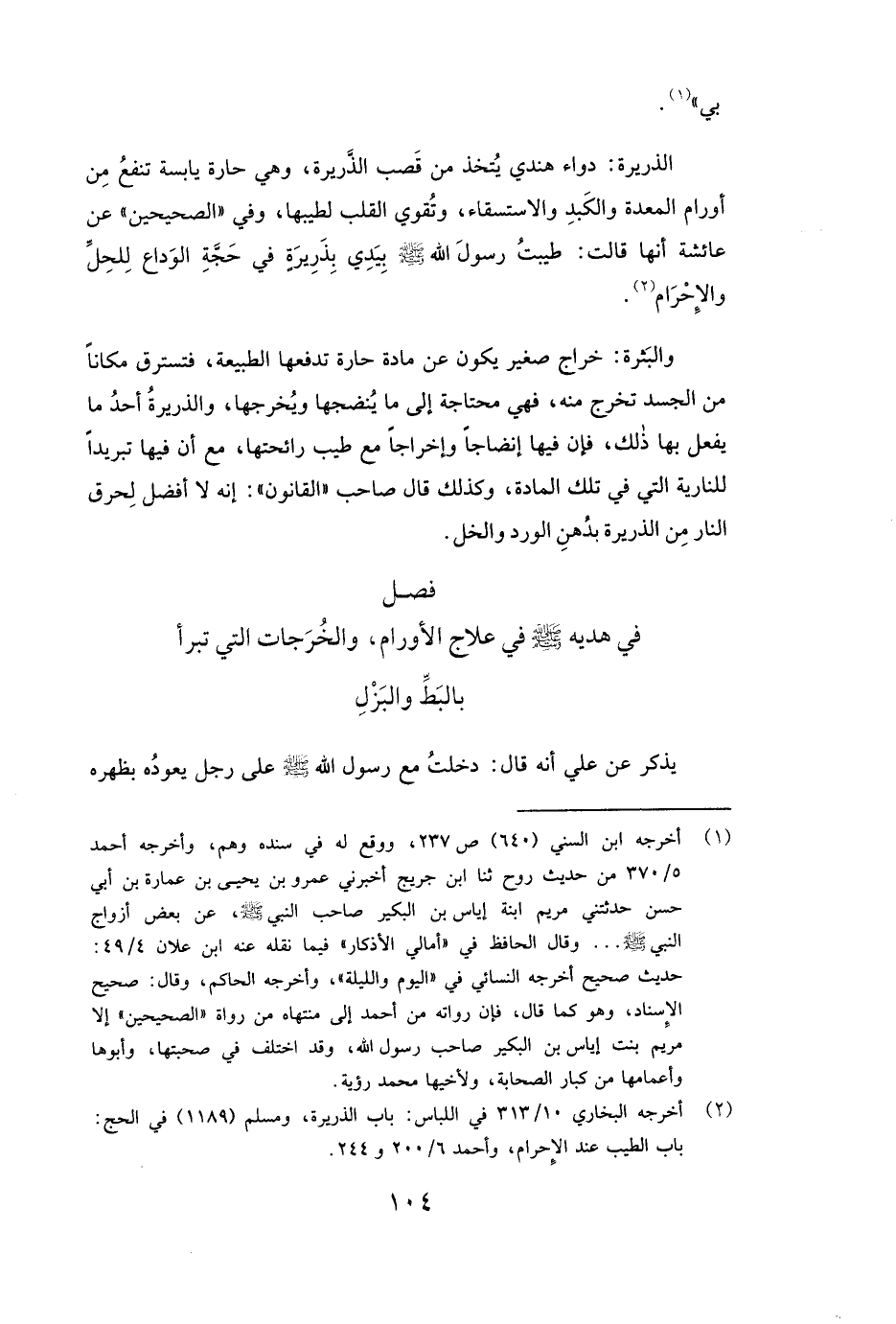 وَالْبَثْرَةُ: خُرَّاجٌ صَغِيرٌ يَكُونُ عَنْ مَادَّةٍ حَارَّةٍ تَدْفَعُهَا الطَّبِيعَةُ، فَتَسْتَرِقُ مَكَانًا مِنَ الْجَسَدِ تَخْرُجُ مِنْهُ، فَهِيَ مُحْتَاجَةٌ إِلَى مَا يُنْضِجُهَا وَيُخْرِجُهَا، وَالذَّرِيرَةُ أَحَدُ مَا يُفْعَلُ بِهَا ذَلِكَ، فَإِنَّ فِيهَا إِنْضَاجًا وَإِخْرَاجًا مَعَ طِيبِ رَائِحَتِهَا، مَعَ أَنَّ فِيهَا تَبْرِيدًا لِلنَّارِيَّةِ الَّتِي فِي تِلْكَ الْمَادَّةِ، وَكَذَلِكَ قَالَ صَاحِبُ " الْقَانُونِ ": إِنَّهُ لَا أَفْضَلَ لِحَرْقِ النَّارِ مِنَ الذَّرِيرَةِ بِدُهْنِ الْوَرْدِ وَالْخَلِّ.