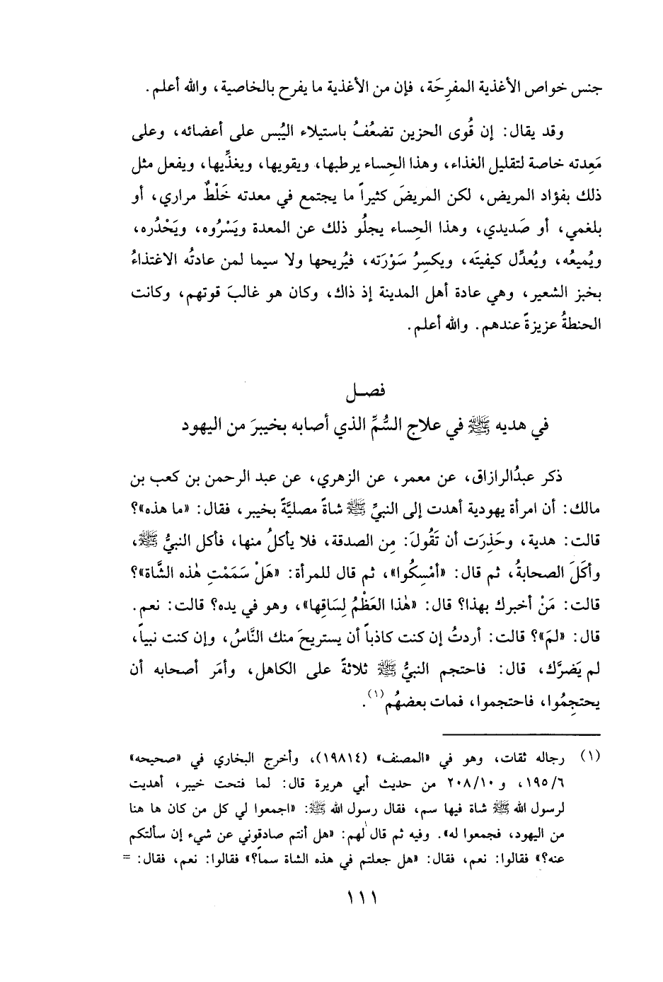 ذَكَرَ عبد الرزاق عَنْ معمر عَنِ الزُّهْرِيِّ عَنْ عبد الرحمن بن كعب بن مالك: ( «أَنَّ امْرَأَةً يَهُودِيَّةً أَهْدَتْ إِلَى النَّبِيِّ صَلَّى اللَّهُ عَلَيْهِ وَسَلَّمَ شَاةً مَصْلِيَّةً بِخَيْبَرَ، فَقَالَ: " مَا هَذِهِ "؟ قَالَتْ: هَدِيَّةٌ وَحَذِرَتْ أَنْ تَقُولَ: مِنَ الصَّدَقَةِ، فَلَا يَأْكُلُ مِنْهَا، فَأَكَلَ النَّبِيُّ صَلَّى اللَّهُ عَلَيْهِ وَسَلَّمَ وَأَكَلَ الصَّحَابَةُ، ثُمَّ قَالَ: " أَمْسِكُوا "، ثُمَّ قَالَ لِلْمَرْأَةِ: " هَلْ سَمَمْتِ هَذِهِ الشَّاةَ "؟ قَالَتْ: مَنْ أَخْبَرَكَ بِهَذَا؟ قَالَ: " هَذَا الْعَظْمُ لِسَاقِهَا " وَهُوَ فِي يَدِهِ؟ قَالَتْ: نَعَمْ. قَالَ: " لِمَ "؟ قَالَتْ: أَرَدْتُ إِنْ كُنْتَ كَاذِبًا أَنْ يَسْتَرِيحَ مِنْكَ النَّاسُ، وَإِنْ كُنْتَ نَبِيًّا، لَمْ يَضُرَّكَ، قَالَ فَاحْتَجَمَ النَّبِيُّ صَلَّى اللَّهُ عَلَيْهِ وَسَلَّمَ ثَلَاثَةً عَلَى الْكَاهِلِ، وَأَمَرَ أَصْحَابَهُ أَنْ يَحْتَجِمُوا، فَاحْتَجَمُوا، فَمَاتَ بَعْضُهُمْ» ) .