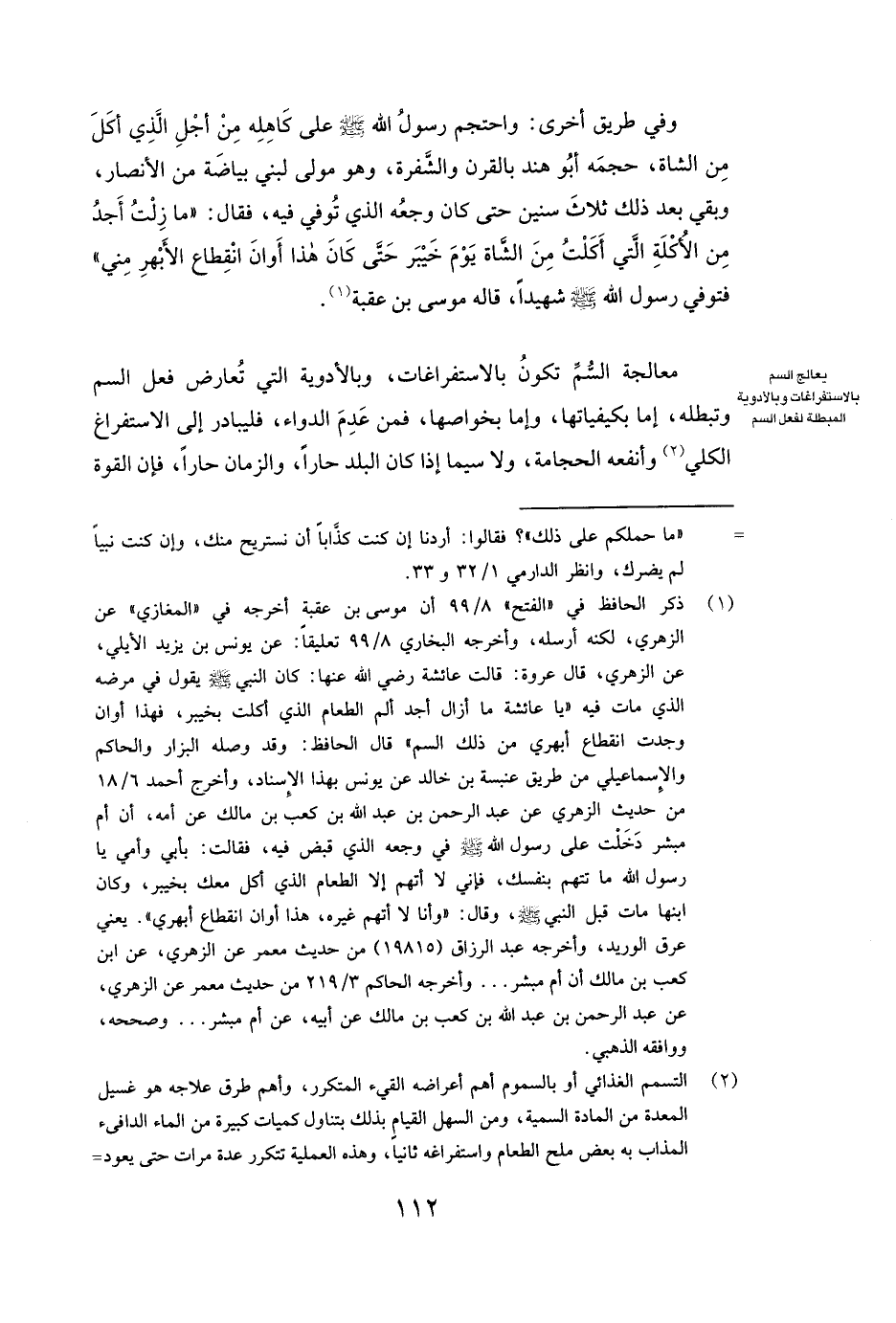 وَفِي طَرِيقٍ أُخْرَى: ( «وَاحْتَجَمَ رَسُولُ اللَّهِ صَلَّى اللَّهُ عَلَيْهِ وَسَلَّمَ عَلَى كَاهِلِهِ مِنْ أَجْلِ الَّذِي أَكَلَ مِنَ الشَّاةِ، حَجَمَهُ أبو هند بِالْقَرْنِ وَالشَّفْرَةِ، وَهُوَ مَوْلًى لِبَنِي بَيَاضَةَ مِنَ الْأَنْصَارِ، وَبَقِيَ بَعْدَ ذَلِكَ ثَلَاثَ سِنِينَ حَتَّى كَانَ وَجَعُهُ الَّذِي تُوُفِّيَ فِيهِ، فَقَالَ: "مَا زِلْتُ أَجِدُ مِنَ الْأُكْلَةِ الَّتِي أَكَلْتُ مِنَ الشَّاةِ يَوْمَ خَيْبَرَ حَتَّى كَانَ هَذَا أَوَانَ انْقِطَاعِ الْأَبْهَرِ مِنِّي» فَتُوُفِّيَ رَسُولُ اللَّهِ صَلَّى اللَّهُ عَلَيْهِ وَسَلَّمَ شَهِيدًا، قَالَهُ مُوسَى بْنُ عُقْبَةَ.