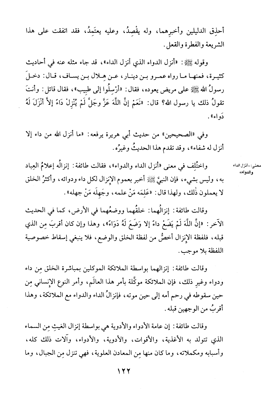 وَاخْتُلِفَ فِي مَعْنَى ( «أَنْزَلَ الدَّاءَ وَالدَّوَاءَ» ) ، فَقَالَتْ طَائِفَةٌ: إِنْزَالُهُ إِعْلَامُ الْعِبَادِ بِهِ، وَلَيْسَ بِشَيْءٍ، فَإِنَّ النَّبِيَّ صَلَّى اللَّهُ عَلَيْهِ وَسَلَّمَ أَخْبَرَ بِعُمُومِ الْإِنْزَالِ لِكُلِّ دَاءٍ وَدَوَائِهِ، وَأَكْثَرُ الْخَلْقِ لَا يَعْلَمُونَ ذَلِكَ وَلِهَذَا قَالَ ( «عَلِمَهُ مَنْ عَلِمَهُ، وَجَهِلَهُ مَنْ جَهِلَهُ» ) .