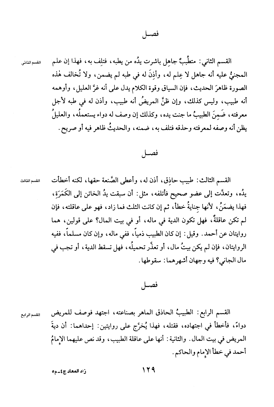 فَصْلٌ الْقِسْمُ الرَّابِعُ: الطَّبِيبُ الْحَاذِقُ الْمَاهِرُ بِصَنَاعَتِهِ، اجْتَهَدَ فَوَصَفَ لِلْمَرِيضِ دَوَاءً فَأَخْطَأَ فِي اجْتِهَادِهِ، فَقَتَلَهُ، فَهَذَا يُخَرَّجُ عَلَى رِوَايَتَيْنِ: إِحْدَاهُمَا: أَنَّ دِيَةَ الْمَرِيضِ فِي بَيْتِ الْمَالِ. وَالثَّانِيَةُ: أَنَّهَا عَلَى عَاقِلَةِ الطَّبِيبِ، وَقَدْ نَصَّ عَلَيْهِمَا الْإِمَامُ أَحْمَدُ فِي خَطَأِ الْإِمَامِ وَالْحَاكِمِ.