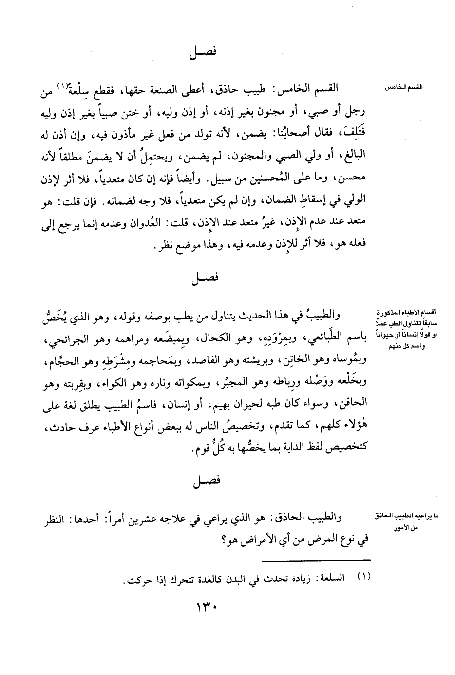 فَصْلٌ الْقِسْمُ الْخَامِسُ: طَبِيبٌ حَاذِقٌ أَعْطَى الصَّنْعَةَ حَقَّهَا، فَقَطَعَ سِلْعَةً مِنْ رَجُلٍ أَوْ صَبِيٍّ أَوْ مَجْنُونٍ بِغَيْرِ إِذْنِهِ، أَوْ إِذْنِ وَلِيِّهِ، أَوْ خَتَنَ صَبِيًّا بِغَيْرِ إِذْنِ وَلِيِّهِ فَتَلِفَ، فَقَالَ أَصْحَابُنَا: يَضْمَنُ، لِأَنَّهُ تَوَلَّدَ مِنْ فِعْلٍ غَيْرِ مَأْذُونٍ فِيهِ، وَإِنْ أَذِنَ لَهُ الْبَالِغُ، أَوْ وَلِيُّ الصَّبِيِّ وَالْمَجْنُونِ، لَمْ يَضْمَنْ، وَيَحْتَمِلُ أَنْ لَا يَضْمَنَ مُطْلَقًا لِأَنَّهُ مُحْسِنٌ، وَمَا عَلَى الْمُحْسِنِينَ مِنْ سَبِيلٍ. وَأَيْضًا فَإِنَّهُ إِنْ كَانَ مُتَعَدِّيًا، فَلَا أَثَرَ لِإِذْنِ الْوَلِيِّ فِي إِسْقَاطِ الضَّمَانِ، وَإِنْ لَمْ يَكُنْ مُتَعَدِّيًا، فَلَا وَجْهَ لِضَمَانِهِ. فَإِنْ قُلْتَ: هُوَ مُتَعَدٍّ عِنْدَ عَدَمِ الْإِذْنِ، غَيْرُ مُتَعَدٍّ عِنْدَ الْإِذْنِ، قُلْتُ: الْعُدْوَانُ وَعَدَمُهُ إِنَّمَا يَرْجِعُ إِلَى فِعْلِهِ هُوَ، فَلَا أَثَرَ لِلْإِذْنِ وَعَدَمِهِ فِيهِ، وَهَذَا مَوْضِعُ نَظَرٍ.
