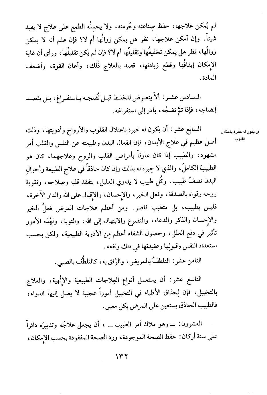 السَّابِعَ عَشَرَ: أَنْ يَكُونَ لَهُ خِبْرَةٌ بِاعْتِلَالِ الْقُلُوبِ وَالْأَرْوَاحِ وَأَدْوِيَتِهَا، وَذَلِكَ أَصْلٌ عَظِيمٌ فِي عِلَاجِ الْأَبْدَانِ، فَإِنَّ انْفِعَالَ الْبَدَنِ وَطَبِيعَتَهُ عَنِ النَّفْسِ وَالْقَلْبِ أَمْرٌ مَشْهُودٌ، وَالطَّبِيبُ إِذَا كَانَ عَارِفًا بِأَمْرَاضِ الْقَلْبِ وَالرُّوحِ وَعِلَاجِهِمَا، كَانَ هُوَ الطَّبِيبَ الْكَامِلَ، وَالَّذِي لَا خِبْرَةَ لَهُ بِذَلِكَ وَإِنْ كَانَ حَاذِقًا فِي عِلَاجِ الطَّبِيعَةِ وَأَحْوَالِ الْبَدَنِ نِصْفُ طَبِيبٍ. وَكُلُّ طَبِيبٍ لَا يُدَاوِي الْعَلِيلَ، بِتَفَقُّدِ قَلْبِهِ وَصَلَاحِهِ، وَتَقْوِيَةِ رُوحِهِ وَقُوَاهُ بِالصَّدَقَةِ، وَفِعْلِ الْخَيْرِ، وَالْإِحْسَانِ، وَالْإِقْبَالِ عَلَى اللَّهِ وَالدَّارِ الْآخِرَةِ، فَلَيْسَ بِطَبِيبٍ، بَلْ مُتَطَبِّبٌ قَاصِرٌ. وَمِنْ أَعْظَمِ عِلَاجَاتِ الْمَرَضِ فِعْلُ الْخَيْرِ، وَالْإِحْسَانُ، وَالذِّكْرُ، وَالدُّعَاءُ، وَالتَّضَرُّعُ، وَالِابْتِهَالُ إِلَى اللَّهِ، وَالتَّوْبَةُ، وَلِهَذِهِ الْأُمُورِ تَأْثِيرٌ فِي دَفْعِ الْعِلَلِ وَحُصُولِ الشِّفَاءِ أَعْظَمُ مِنَ الْأَدْوِيَةِ الطَّبِيعِيَّةِ، وَلَكِنْ بِحَسَبِ اسْتِعْدَادِ النَّفْسِ، وَقَبُولِهَا، وَعَقِيدَتِهَا فِي ذَلِكَ وَنَفْعِهِ.