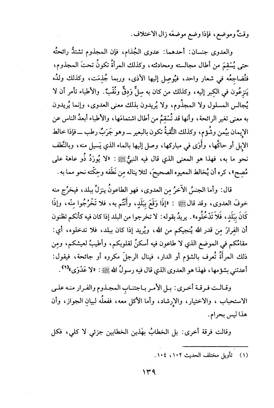 قَالَ: وَأَمَّا الْجِنْسُ الْآخَرُ مِنَ الْعَدْوَى، فَهُوَ الطَّاعُونُ، يَنْزِلُ بِبَلَدٍ، فَيَخْرُجُ مِنْهُ خَوْفَ الْعَدْوَى، وَقَدْ قَالَ - صَلَّى اللَّهُ عَلَيْهِ وَسَلَّمَ -: ( «إِذَا وَقَعَ بِبَلَدٍ وَأَنْتُمْ بِهِ فَلَا تَخْرُجُوا مِنْهُ وَإِذَا كَانَ بِبَلَدٍ فَلَا تَدْخُلُوهُ» ) . يُرِيدُ بِقَوْلِهِ: لَا تَخْرُجُوا مِنَ الْبَلَدِ إِذَا كَانَ فِيهِ كَأَنَّكُمْ تَظُنُّونَ أَنَّ الْفِرَارَ مِنْ قَدَرِ اللَّهِ يُنْجِيكُمْ مِنَ اللَّهِ، وَيُرِيدُ إِذَا كَانَ بِبَلَدٍ فَلَا تَدْخُلُوهُ، أَيْ مَقَامُكُمْ فِي الْمَوْضِعِ الَّذِي لَا طَاعُونَ فِيهِ أَسْكَنُ لِقُلُوبِكُمْ، وَأَطْيَبُ لِعَيْشِكُمْ، وَمِنْ ذَلِكَ الْمَرْأَةُ تُعْرَفُ بِالشُّؤْمِ أَوِ الدَّارُ، فَيَنَالُ الرَّجُلَ مَكْرُوهٌ، أَوْ جَائِحَةٌ فَيَقُولُ: أَعَدَتْنِي بِشُؤْمِهَا، فَهَذَا هُوَ الْعَدْوَى الَّذِي قَالَ فِيهِ رَسُولُ اللَّهِ - صَلَّى اللَّهُ عَلَيْهِ وَسَلَّمَ -: ( «لَا عَدْوَى» )