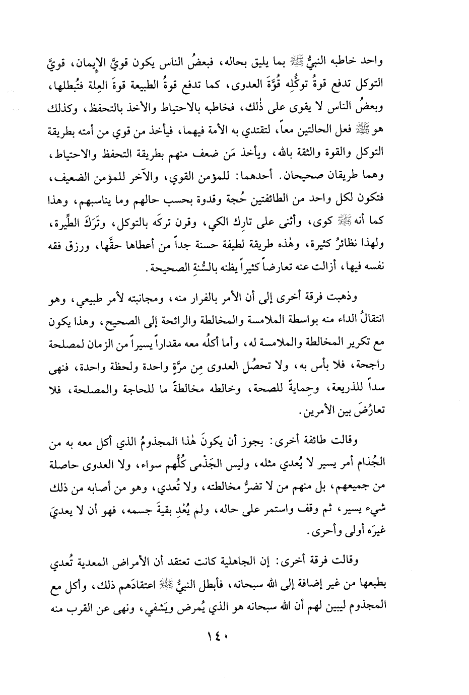 وَاحِدٍ خَاطَبَهُ النَّبِيُّ - صَلَّى اللَّهُ عَلَيْهِ وَسَلَّمَ - بِمَا يَلِيقُ بِحَالِهِ، فَبَعْضُ النَّاسِ يَكُونُ قَوِيَّ الْإِيمَانِ، قَوِيَّ التَّوَكُّلِ، تَدْفَعُ قُوَّةُ تَوَكُّلِهِ قُوَّةَ الْعَدْوَى، كَمَا تَدْفَعُ قُوَّةُ الطَّبِيعَةِ قُوَّةَ الْعِلَّةِ، فَتُبْطِلُهَا، وَبَعْضُ النَّاسِ لَا يَقْوَى عَلَى ذَلِكَ، فَخَاطَبَهُ بِالِاحْتِيَاطِ وَالْأَخْذِ بِالتَّحَفُّظِ، وَكَذَلِكَ هُوَ - صَلَّى اللَّهُ عَلَيْهِ وَسَلَّمَ - فَعَلَ الْحَالَتَيْنِ مَعًا؛ لِتَقْتَدِيَ بِهِ الْأُمَّةُ فِيهِمَا، فَيَأْخُذَ مَنْ قَوِيَ مِنْ أُمَّتِهِ بِطَرِيقَةِ التَّوَكُّلِ، وَالْقُوَّةِ، وَالثِّقَةِ بِاللَّهِ، وَيَأْخُذَ مَنْ ضَعُفَ مِنْهُمْ بِطَرِيقَةِ التَّحَفُّظِ، وَالِاحْتِيَاطِ، وَهُمَا طَرِيقَانِ صَحِيحَانِ.
