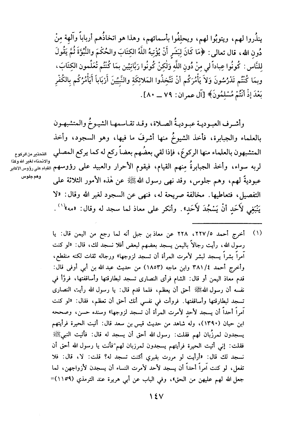 وَأَشْرَفُ الْعُبُودِيَّةِ عُبُودِيَّةُ الصَّلَاةِ، وَقَدْ تَقَاسَمَهَا الشَّيُوخُ وَالْمُتَشَبِّهُونَ بِالْعُلَمَاءِ وَالْجَبَابِرَةُ، فَأَخَذَ الشَّيُوخُ مِنْهَا أَشْرَفَ مَا فِيهَا وَهُوَ السَّجُودُ، وَأَخَذَ الْمُتَشَبِّهُونَ بِالْعُلَمَاءِ مِنْهَا الرُّكُوعَ، فَإِذَا لَقِيَ بَعْضُهُمْ بَعْضًا رَكَعَ لَهُ، كَمَا يَرْكَعُ الْمُصَلِّي لِرَبِّهِ سَوَاءً، وَأَخَذَ الْجَبَابِرَةُ مِنْهُمُ الْقِيَامَ فَيَقُومُ الْأَحْرَارُ وَالْعَبِيدُ عَلَى رُءُوسِهِمْ، عُبُودِيَّةً لَهُمْ وَهُمْ جُلُوسٌ، وَقَدْ نَهَى رَسُولُ اللَّهِ - صَلَّى اللَّهُ عَلَيْهِ وَسَلَّمَ - عَنْ هَذِهِ الْأُمُورِ الثَّلَاثَةِ، عَلَى التَّفْصِيلِ فَتَعَاطِيهَا مُخَالَفَةٌ صَرِيحَةٌ لَهُ فَنَهَى عَنِ السُّجُودِ لِغَيْرِ اللَّهِ وَقَالَ: ( «لَا يَنْبَغِي لِأَحَدٍ أَنْ يَسْجُدَ لِأَحَدٍ» ) ( «وَأَنْكَرَ عَلَى معاذ لَمَّا سَجَدَ لَهُ وَقَالَ " مَهْ» ) .