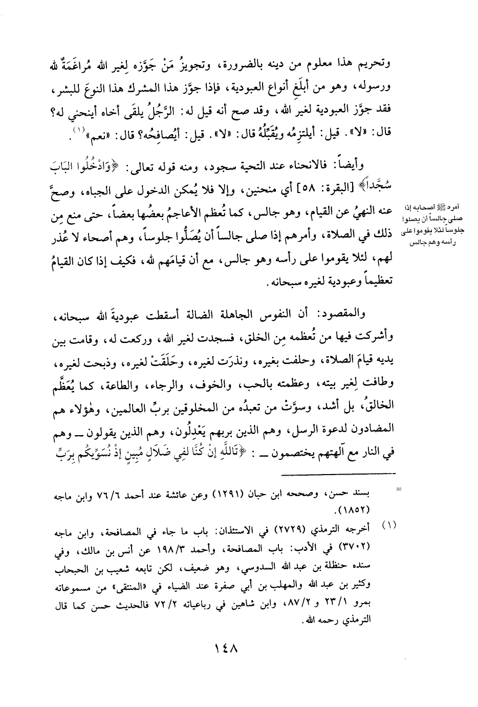 وَتَحْرِيمُ هَذَا مَعْلُومٌ مِنْ دِينِهِ بِالضَّرُورَةِ، وَتَجْوِيزُ مَنْ جَوَّزَهُ لِغَيْرِ اللَّهِ مُرَاغَمَةٌ لِلَّهِ وَرَسُولِهِ، وَهُوَ مِنْ أَبْلَغِ أَنْوَاعِ الْعُبُودِيَّةِ، فَإِذَا جَوَّزَ هَذَا الْمُشْرِكُ هَذَا النَّوْعَ لِلْبَشَرِ، فَقَدْ جَوَّزَ الْعُبُودِيَّةَ لِغَيْرِ اللَّهِ، وَقَدْ صَحَّ أَنَّهُ ( «قِيلَ لَهُ: الرَّجُلُ يَلْقَى أَخَاهُ أَيَنْحَنِي لَهُ؟ قَالَ: " لَا ". قِيلَ: أَيَلْتَزِمُهُ وَيُقَبِّلُهُ قَالَ: " لَا ". قِيلَ أَيُصَافِحُهُ؟ قَالَ " نَعَمْ» ) .