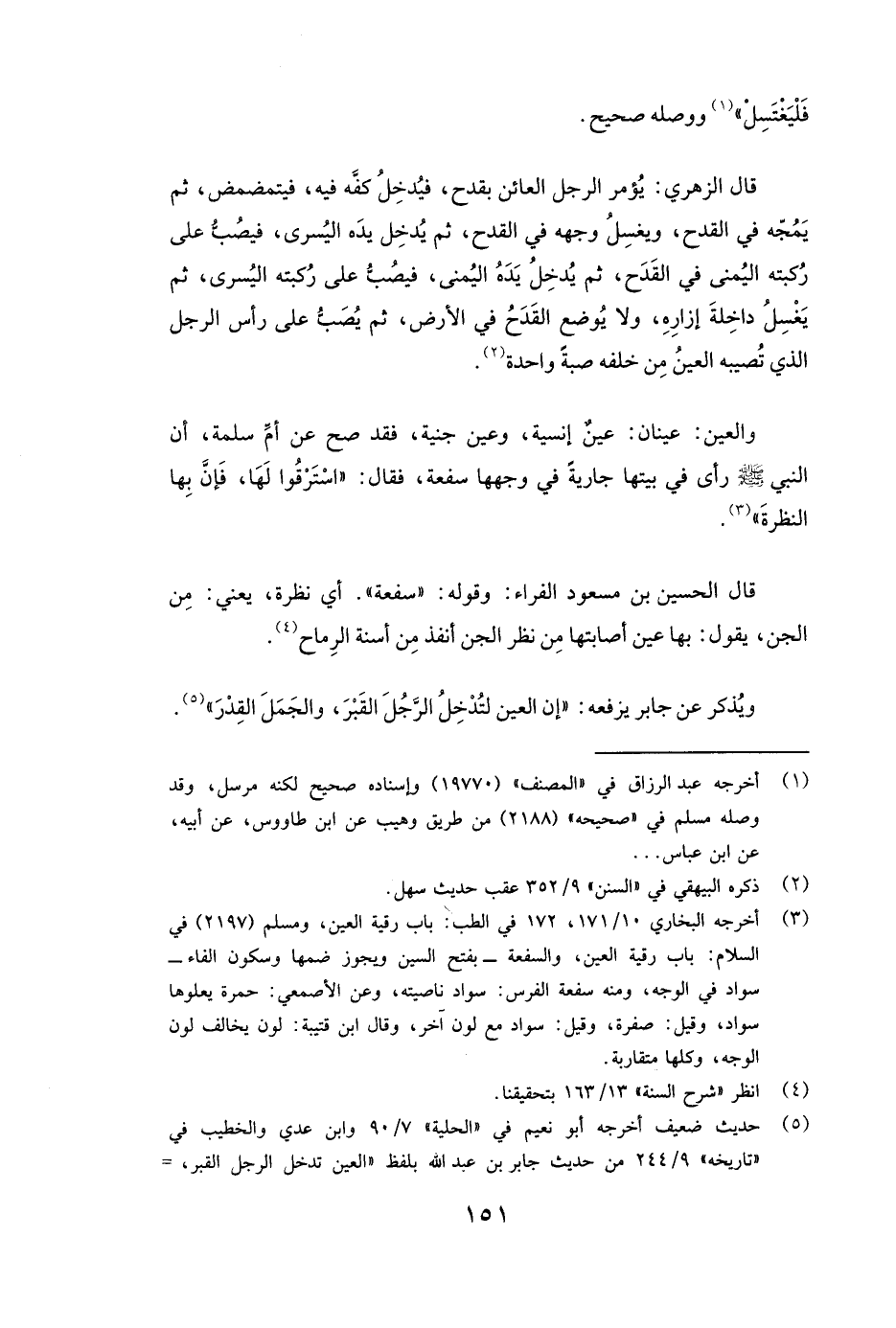 قَالَ الزُّهْرِيُّ: يُؤْمَرُ الرَّجُلُ الْعَائِنُ بِقَدَحٍ، فَيُدْخِلُ كَفَّهُ فِيهِ، فَيَتَمَضْمَضُ، ثُمَّ يَمُجُّهُ فِي الْقَدَحِ، وَيَغْسِلُ وَجْهَهُ فِي الْقَدَحِ، ثُمَّ يُدْخِلُ يَدَهُ الْيُسْرَى فَيَصُبُّ عَلَى رُكْبَتِهِ الْيُمْنَى فِي الْقَدَحِ، ثُمَّ يُدْخِلُ يَدَهُ الْيُمْنَى فَيَصُبُّ عَلَى رُكْبَتِهِ الْيُسْرَى، ثُمَّ يَغْسِلُ دَاخِلَةَ إِزَارِهِ، وَلَا يُوضَعُ الْقَدَحُ فِي الْأَرْضِ، ثُمَّ يُصَبُّ عَلَى رَأْسِ الرَّجُلِ الَّذِي تُصِيبُهُ الْعَيْنُ مِنْ خَلْفِهِ صَبَّةً وَاحِدَةً.